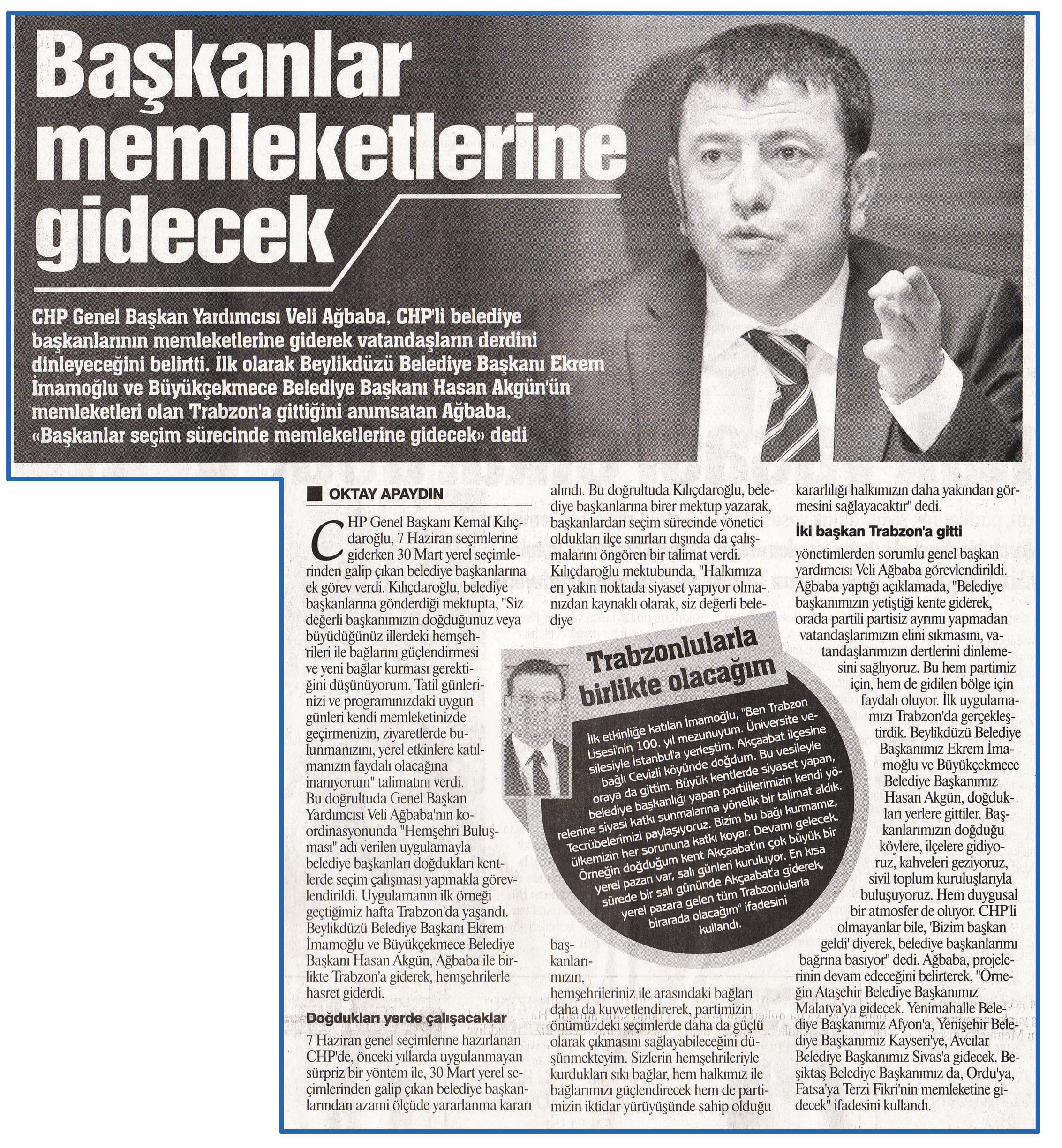 22 Nisan 2015 tarihli ''GAZETE İSTANBUL'' gazetesi. CHP Genel Başkan Yardımcısı Veli Ağbaba, CHP'li belediye başkanlarının memleketlerine giderek vatandaşların derdini dinleyeceğini belirtti.