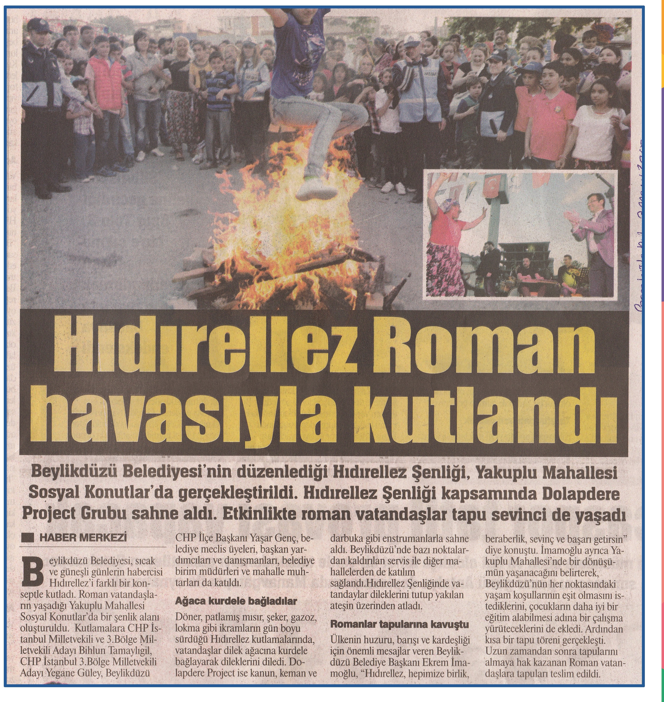 7 Mayıs 2015 tarihli ''GAZETE İSTANBUL'' gazetesi. Beylikdüzü Belediyesi'nin düzenlediği Hıdırellez Şenliği,Yakuplu Mahallesi Sosyal Konutlar'da gerçekleştirildi.Hıdırellez Şenliği kapsamında Dolapdere Project Grubu sahne aldı.Etkinlikte roman vatandaşlar tapu sevinci de yaşadı.