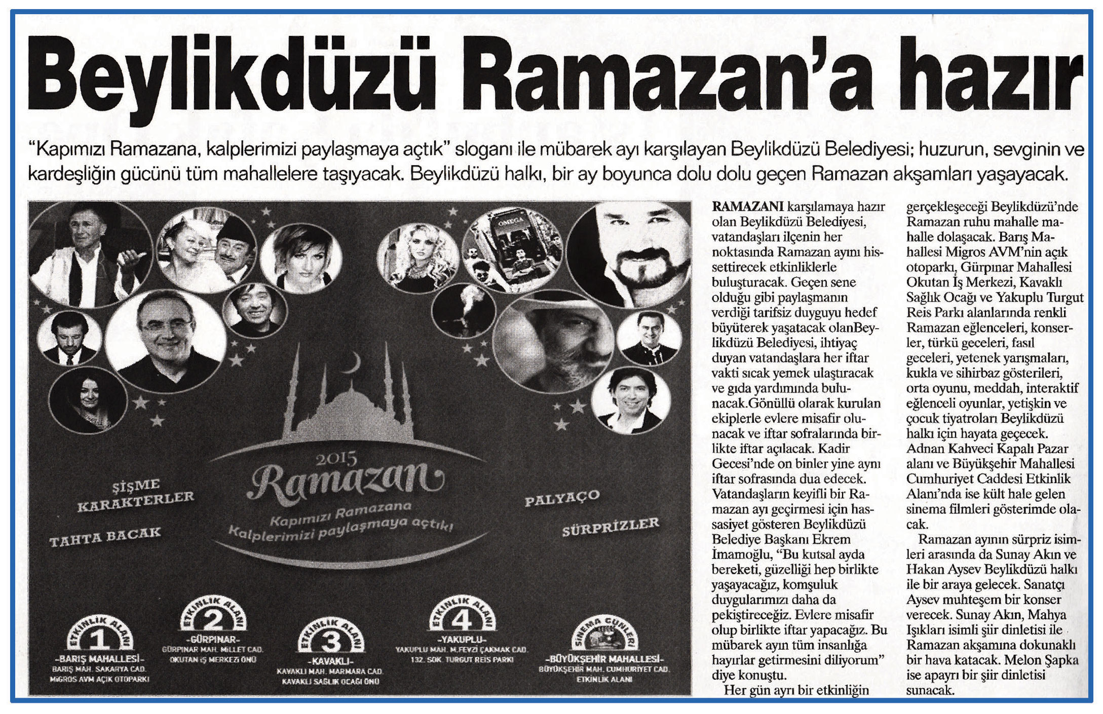 17 Haziran 2015 tarihli "HABER EKSPRESS" gazetesi. " Kapımızı Ramazana, kalplerimizi paylaşmaya açtık" sloganı ile mübarek ayı karşılayan Beylikdüzü Belediyesi; huzurun, sevginin ve kardeşliğin gücünü tüm mahallelere taşıyacak. Beylikdüzü halkı, bir ay boyunda dolu dolu geçen Ramazan akşamları yaşayacak.
