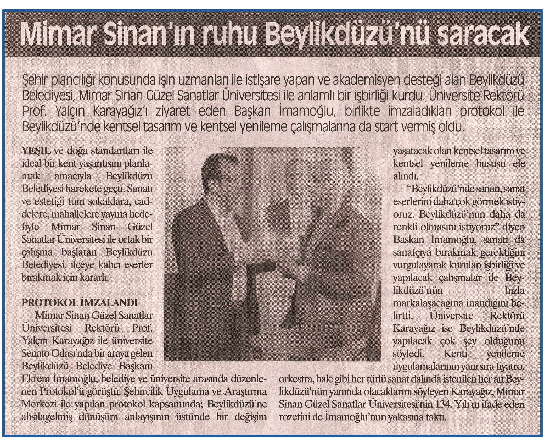 14 Mayıs 2015 tarihli ''DEĞİŞİM'' gazetesi. Şehir plancılığı konusunda işin uzmanları ile istişare yapan ve akademisyen desteği alan Beylikdüzü Belediyesi,Mimar Sinan Güzel Sanatlar Üniversitesi ile anlamlı bir işbirliği kurdu.Üniversite Rektörü Prof. Yalçın Karayağız'ı ziyaret eden Başkan İmamoğlu,birlikte imzaladıkları protokol ile Beylikdüzü'nde kentsel tasarım ve kentsel yenileme çalışmalarına da start vermiş oldu.
