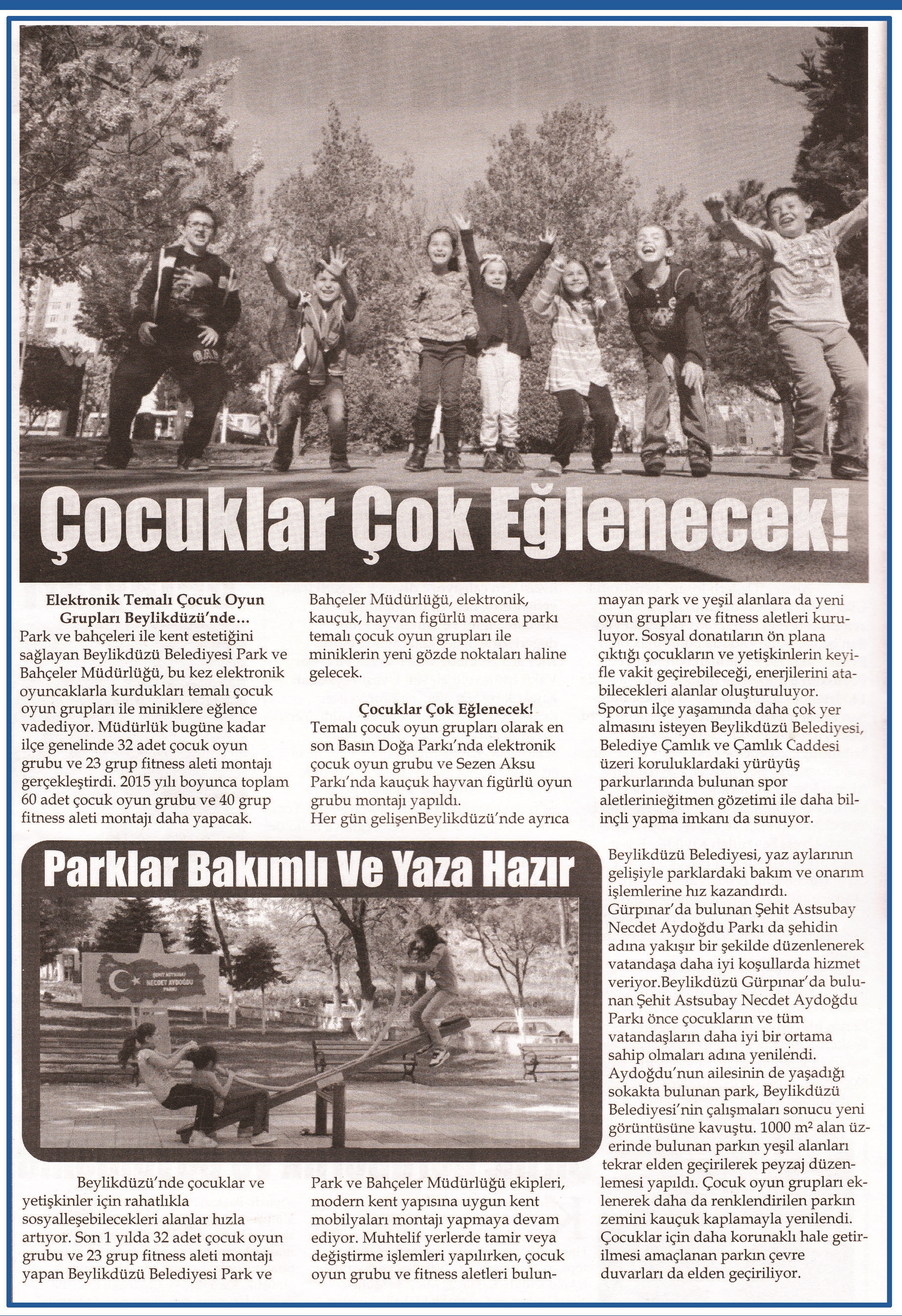 15 Mayıs 2015 tarihli ''BEYLİKDÜZÜ'' gazetesi. Park ve bahçeleri ile kent estetiğini sağlayan Beylikdüzü Belediyesi Park ve Bahçeler Müdürlüğü,bu kez elektronik oyuncaklarla kurdukları temalı çocuk oyun grupları ile miniklere eğlence vadediyor.