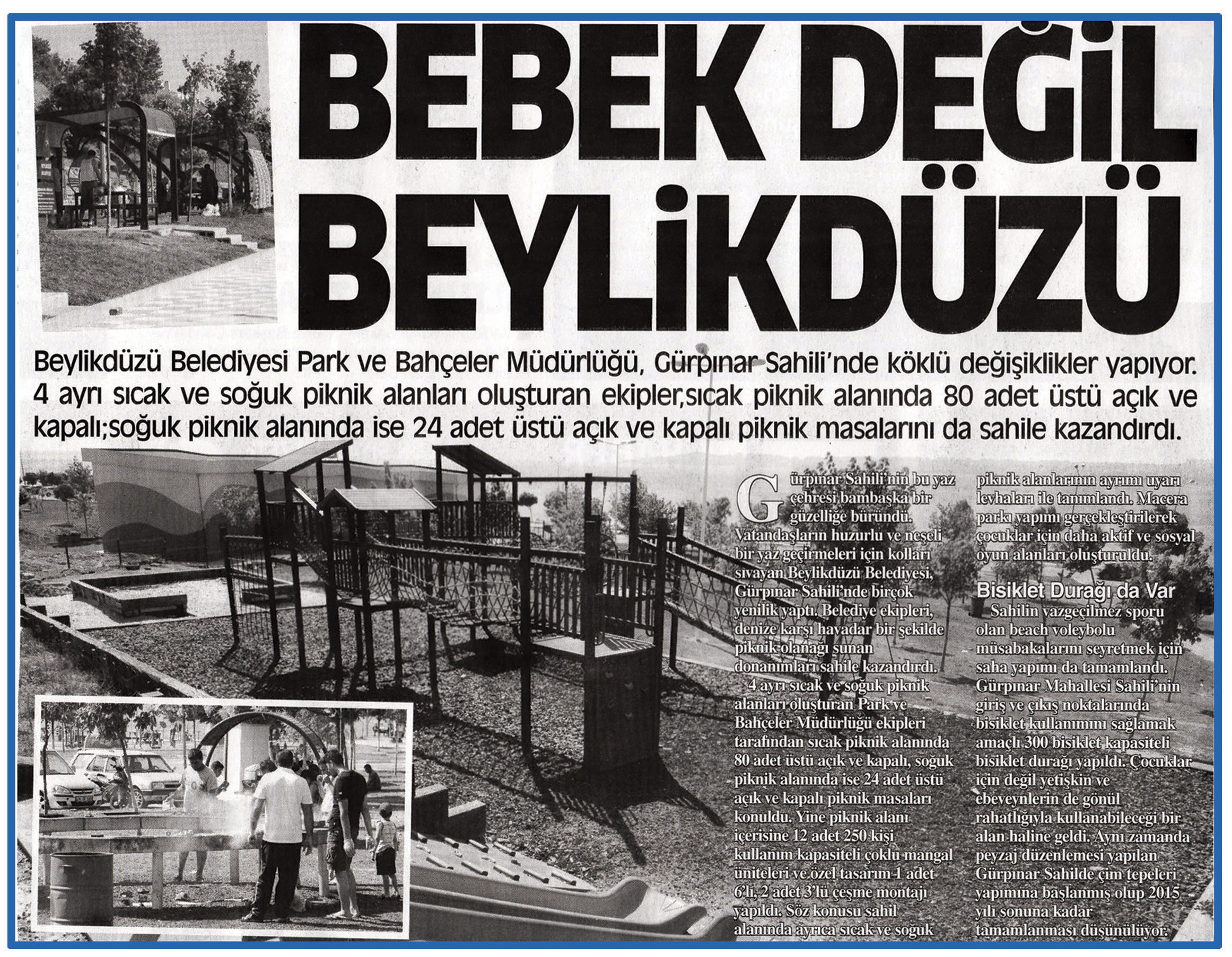 4 Ağustos 2015 tarihli "HABER EKSPRESS" gazetesi. Beylikdüzü Belediyesi Park ve Bahçeler Müdürlüğü, Gürpınar Sahili'nde köklü değişiklikler yapıyor. 4 ayrı sıcak ve soğuk piknik alanları oluşturan ekipler, sıcak piknik alanında 80 adet üstü açık ve kapalı; soğuk piknik alanında ise 24 adet üstü açık ve kapalı piknik masalarını da sahile kazandırdı