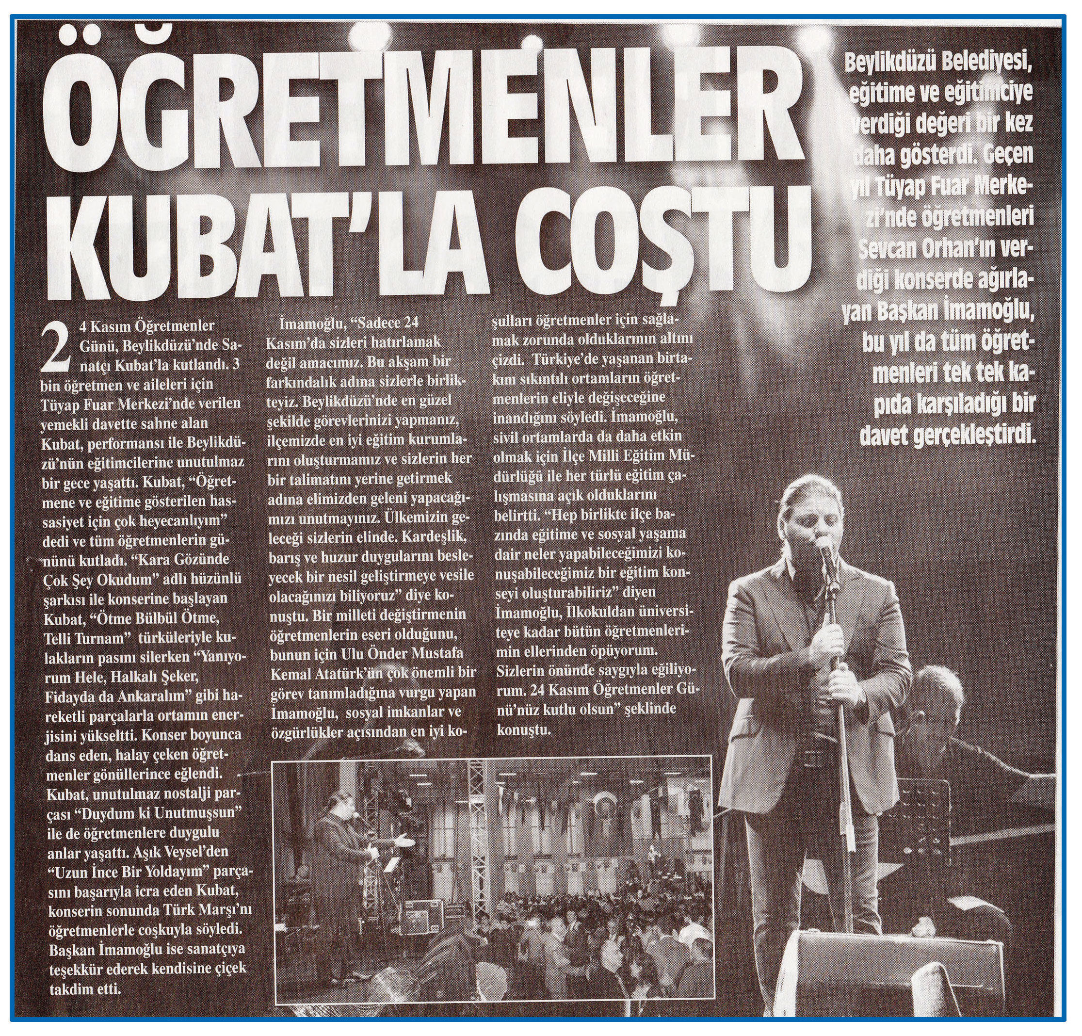 7 Aralık 2015 tarihli "SIRDAŞ HABER" gazetesi. Beylikdüzü Belediyesi,eğitime ve eğitimciye verdiği değeri bir kez daha gösterdi. Geçen yıl Tüyap Fuar Merkezi'nde öğretmenleri Sevcan Orhan'ın verdiği konserde ağırlayan Başkan İmamoğlu, bu yıl da tüm öğretmenleri tek tek kapıda karşıladığı bir davet gerçekleştirdi.