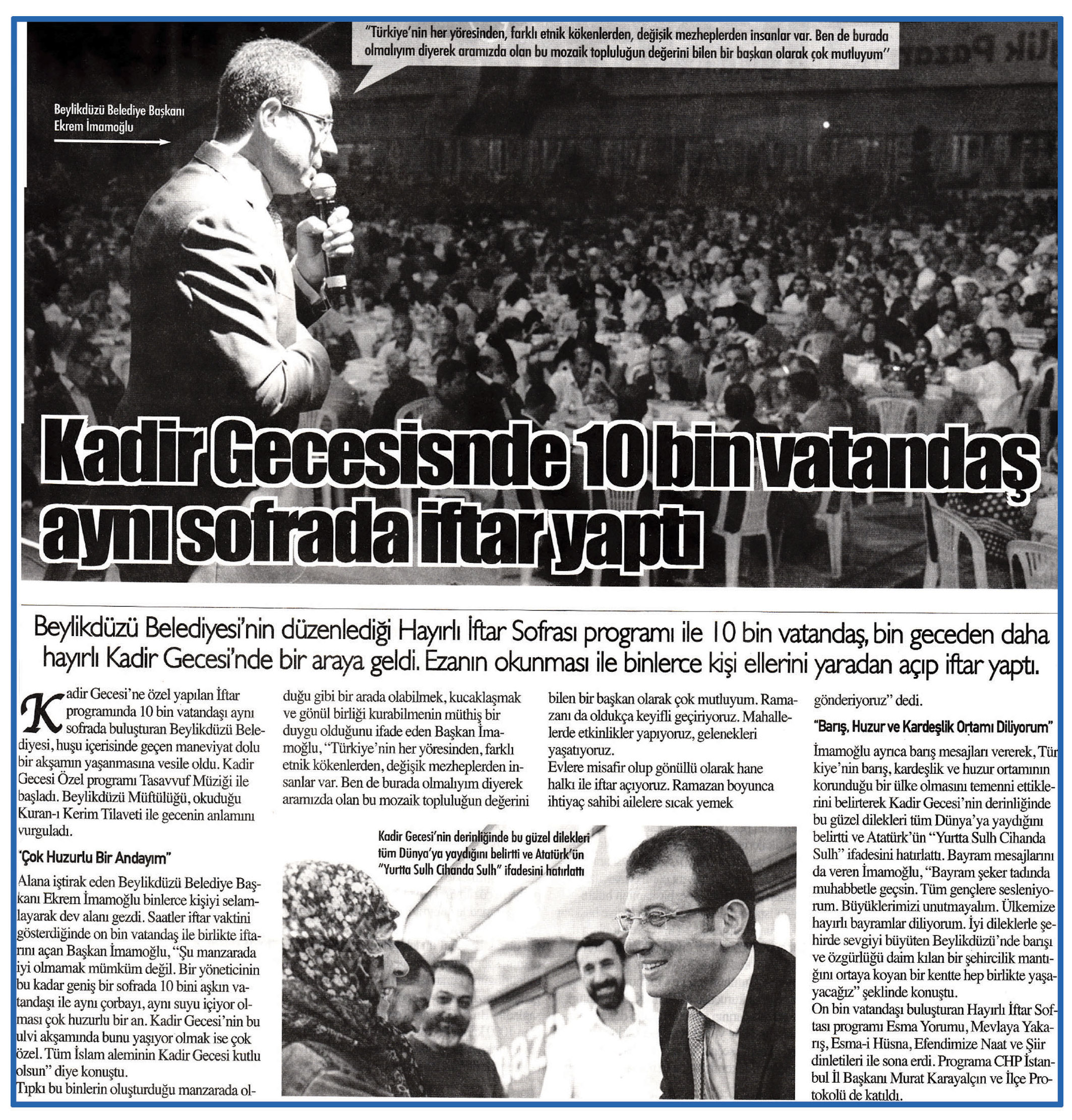 24 Temmzu 2015 tarihli ''AYNA'' gazetesi. Beylikdüzü Belediyesi'nin düzenlediği Hayırlı İftar Sofrası programı ile 10 bin vatandaş, bin geceden daha hayırlı Kadir Gecesi'nde bir araya geldi. Ezanın okunması ile binlerce kişi ellerini yaradan açıp iftar yaptı.