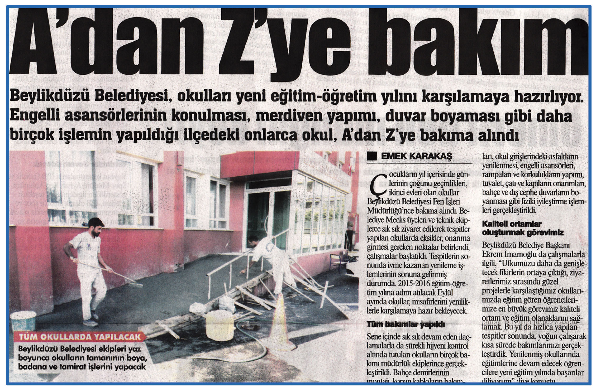29 Temmuz 2015 tarihli ''GAZETE İSTANBUL'' gazetesi. Beylikdüzü Belediyesi,okulları yeni eğitim-öğretim yılını karşılamaya hazırlıyor.Engelli asansörlerinin konulması,merdiven yapımı,duvar boyaması gibi daha birçok işlemin yapıldığı ilçedeki onlarca okul,A'dan Z'ye bakıma alındı.