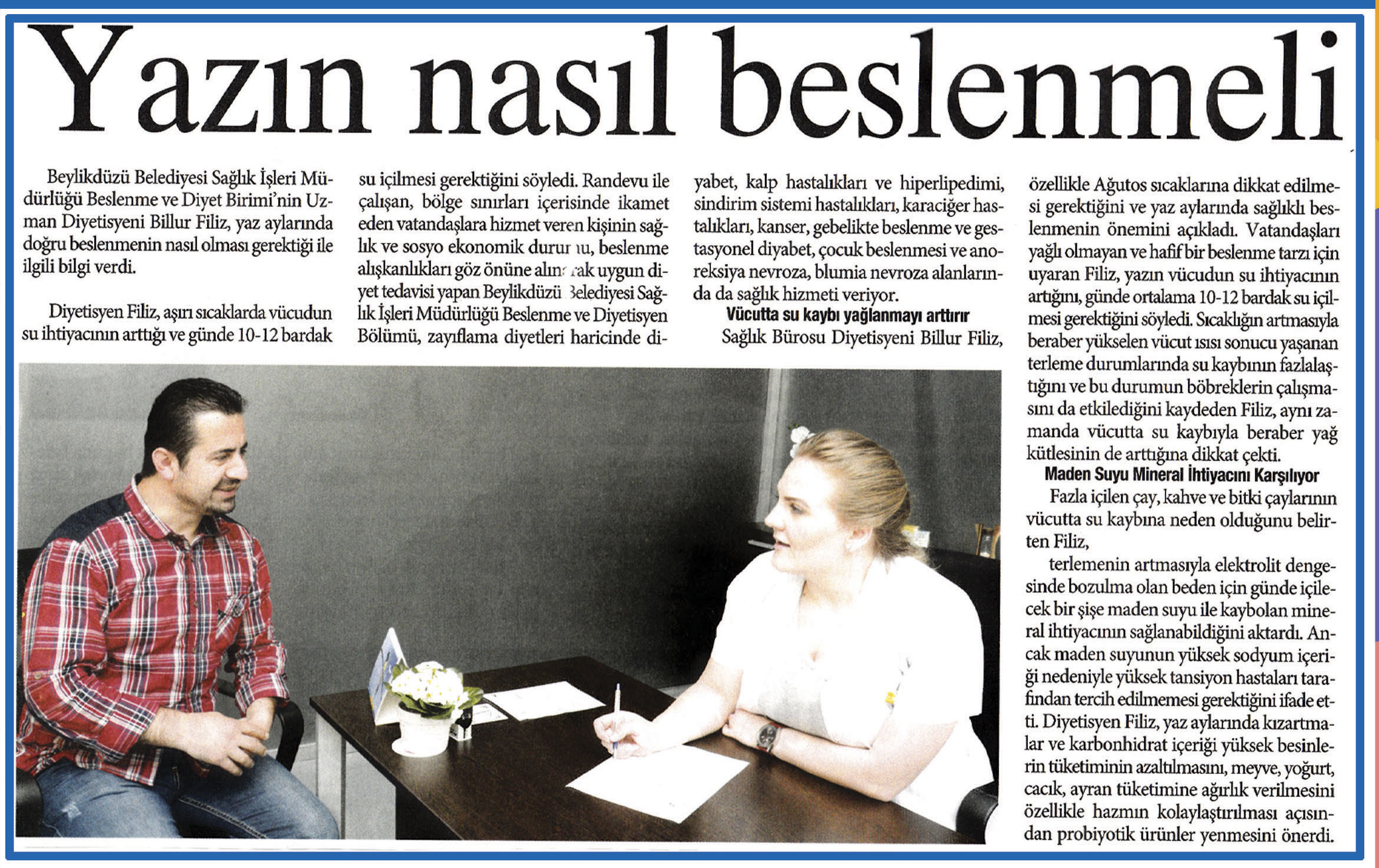 17 Ağustos 2015 tarihli ''BİZİMYAŞAM'' gazetesi. Beylikdüzü Belediyesi Sağlık İşleri Müdürlüğü Beslenme ve Diyet Birimi'nin Uzman Diyetisyeni Billur Filiz,yaz aylarında doğru beslenmenin nasıl olması gerektiği ile ilgili bilgi verdi.