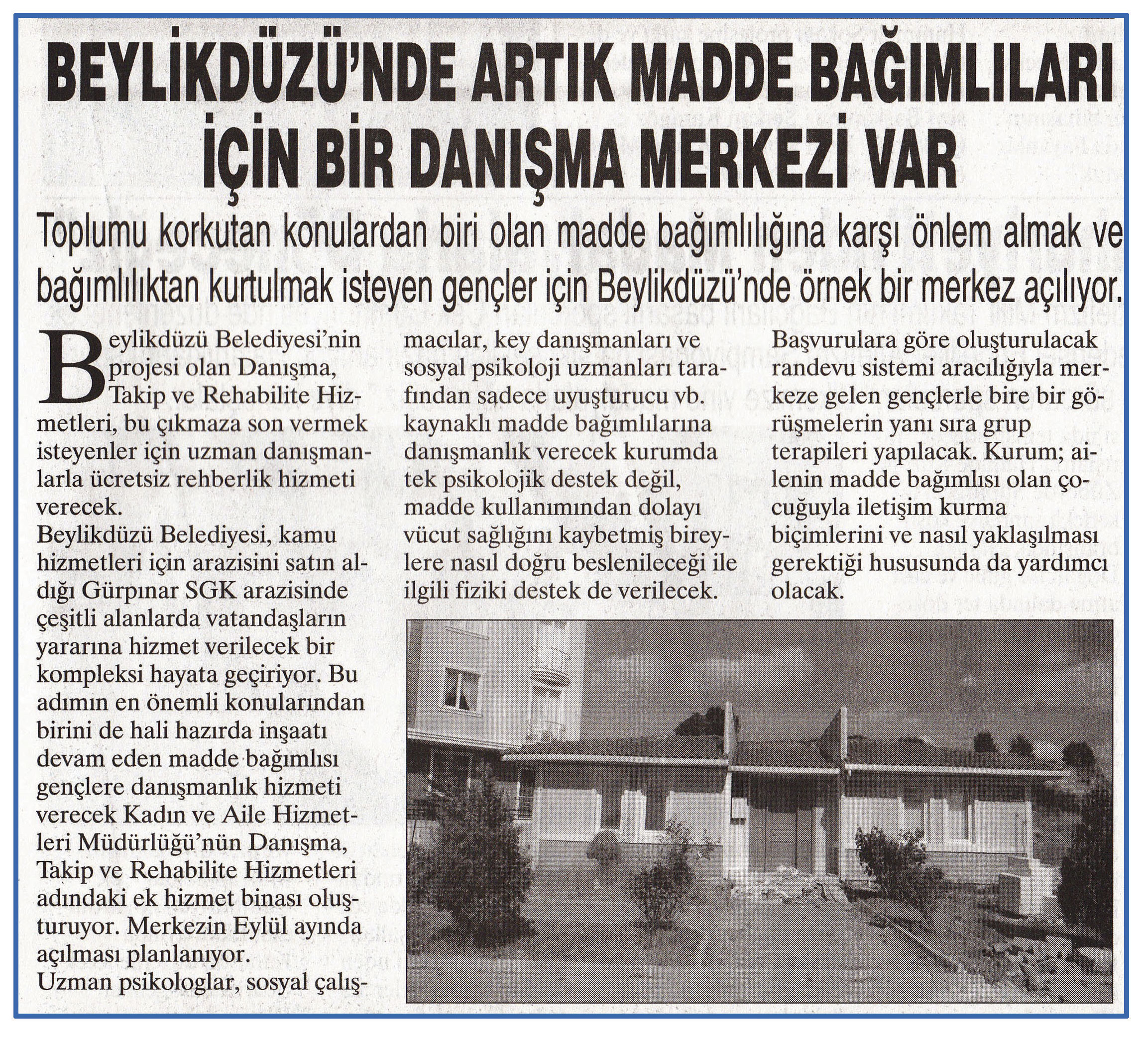 25 ağustos 2015 tarihli ''BÜYÜKÇEKMECE'' gazetesi. Beylikdüzü Belediyesi'nin projesi olan Danışma,Takip ve Rehabilite Hizmetleri,bu çıkmaza son vermek isteyenler için uzman danışmanlarla ücretsiz rehberlik hizmeti verecek..