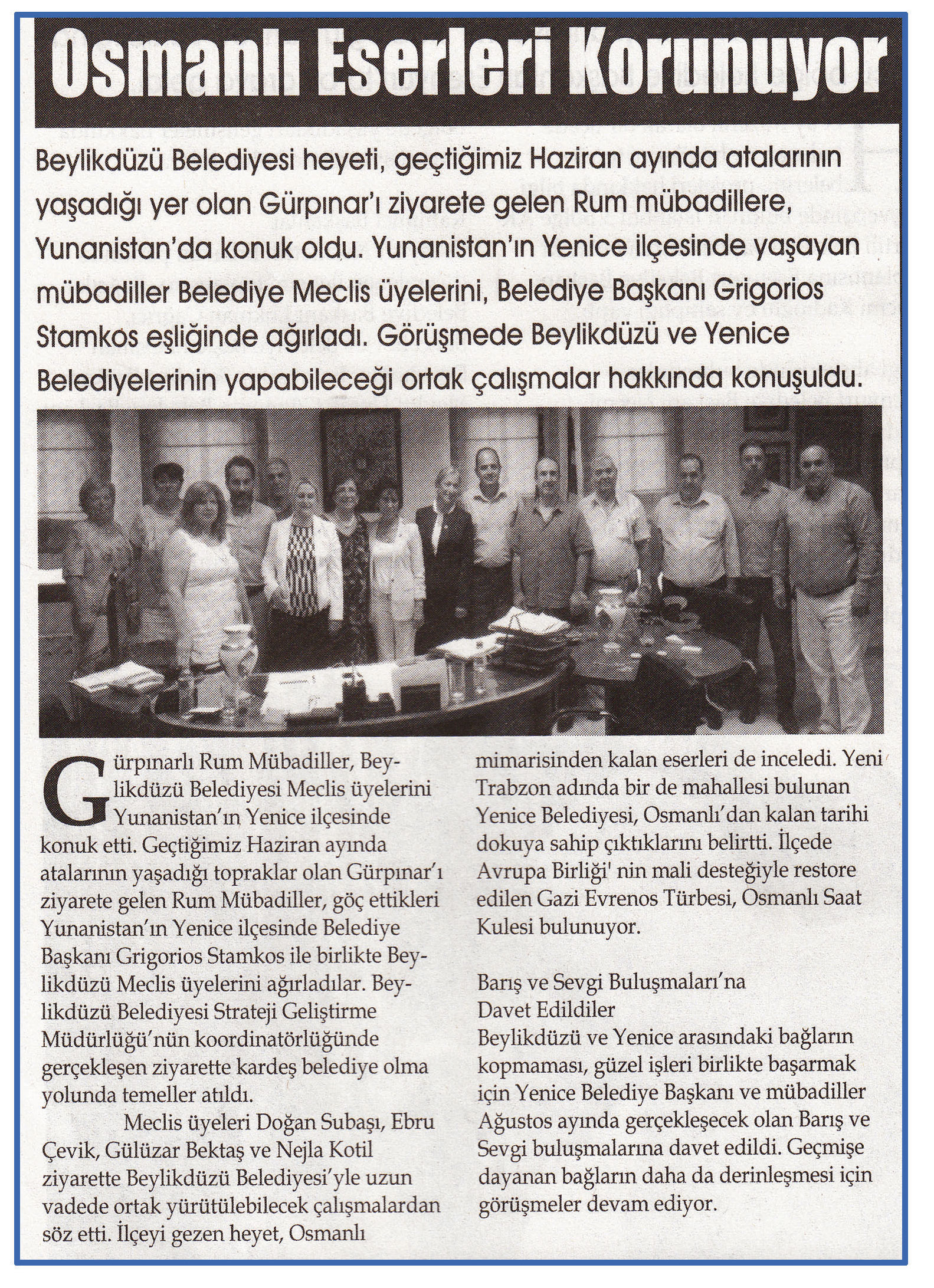 31 ağustos 2015 tarihli ''BEYLİKDÜZÜ'' gazetesi. Beylikdüzü Belediyesi heyeti,geçtiğimiz Haziran ayında atalarının yaşadığı yer olan Gürpınar'ı ziyarete gelen Rum mübadillere,Yunanistan'da konuk oldu.