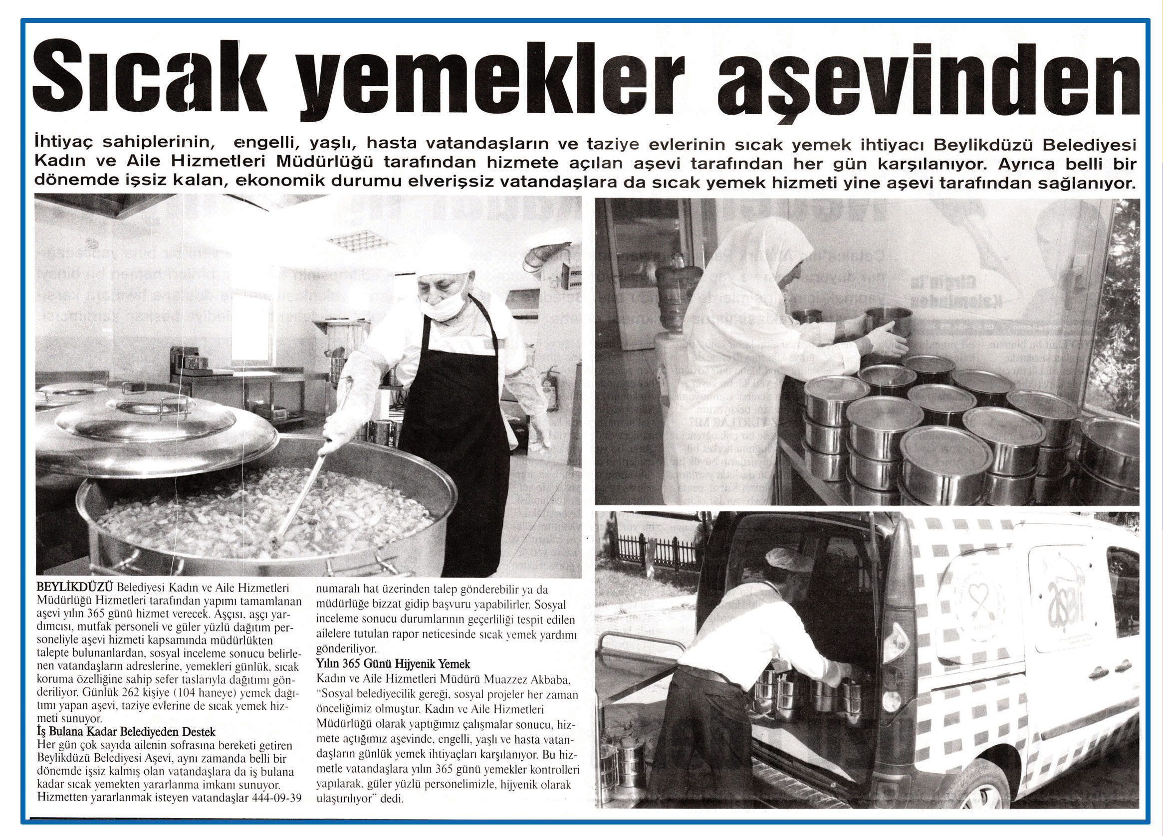 2 eylül 2015 tarihli ''MARMARA'' gazetesi. İhtiyaç sahiplerinin,engelli,yaşlı,hasta vatandaşların ve taziye evlerinin sicak yemek ihtiyacı Beylikdüzü Belediyesi Kadın ve Aile Hizmetleri Müdürlüğü tarafından hizmete açılan aşevi tarafından her gün karşılanıyor.Ayrıca belli bir dönemde işsiz kalan,ekonomik durumu elverişsiz vatandaşlara da sicak yemek hizmeti yine aşevi tarafından sağlanıyor.