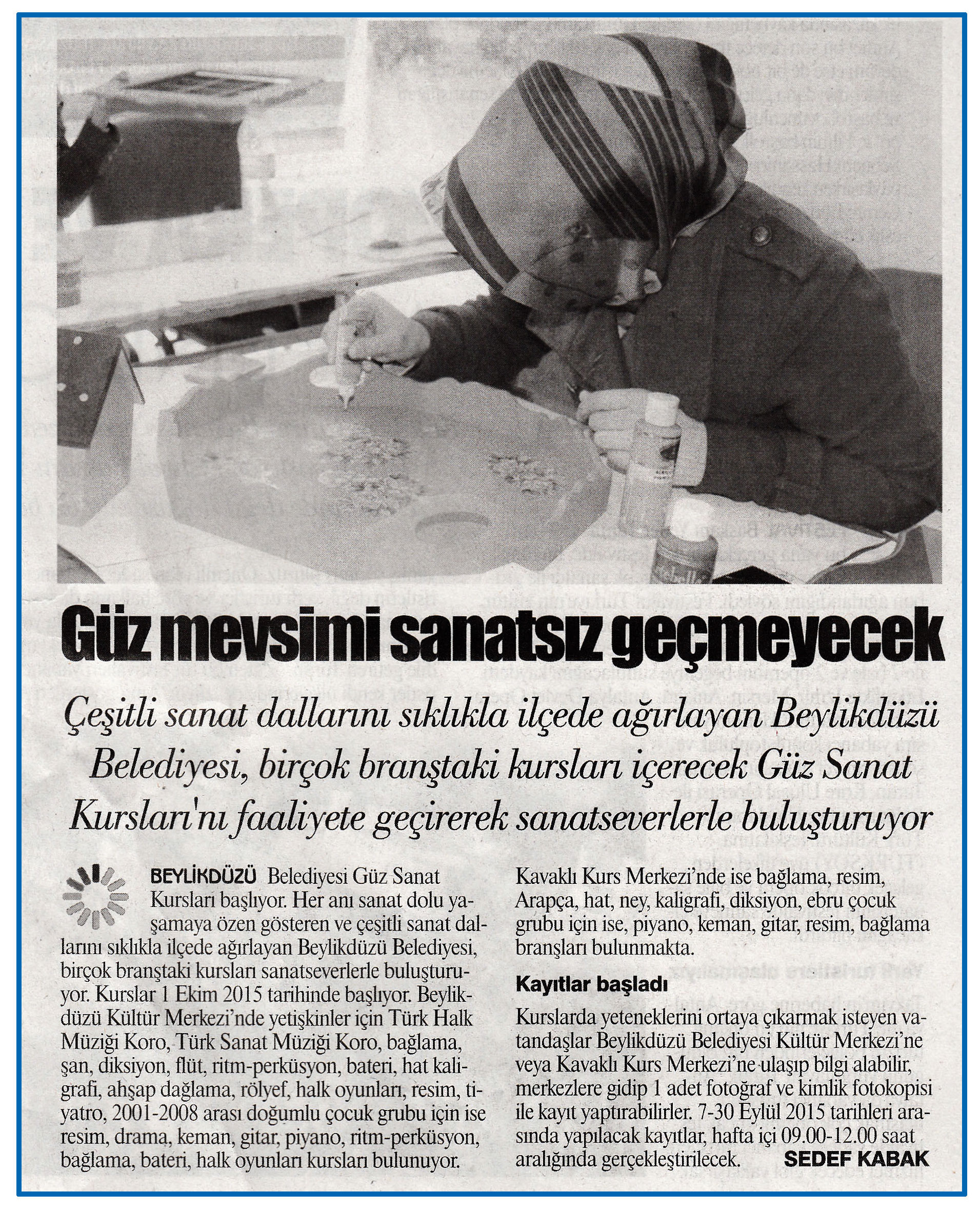 7 eylül 2015 tarihli ''GAZETE İSTANBUL'' gazetesi. Çeşitli sanat dallarını sıklıkla ilçede ağırlayan Beylikdüzü Belediyesi,birçok branştaki kursları içerecek Güz Sanat Kursları'nı faaliyete geçirerek sanatseverlerle buluşturuyor.