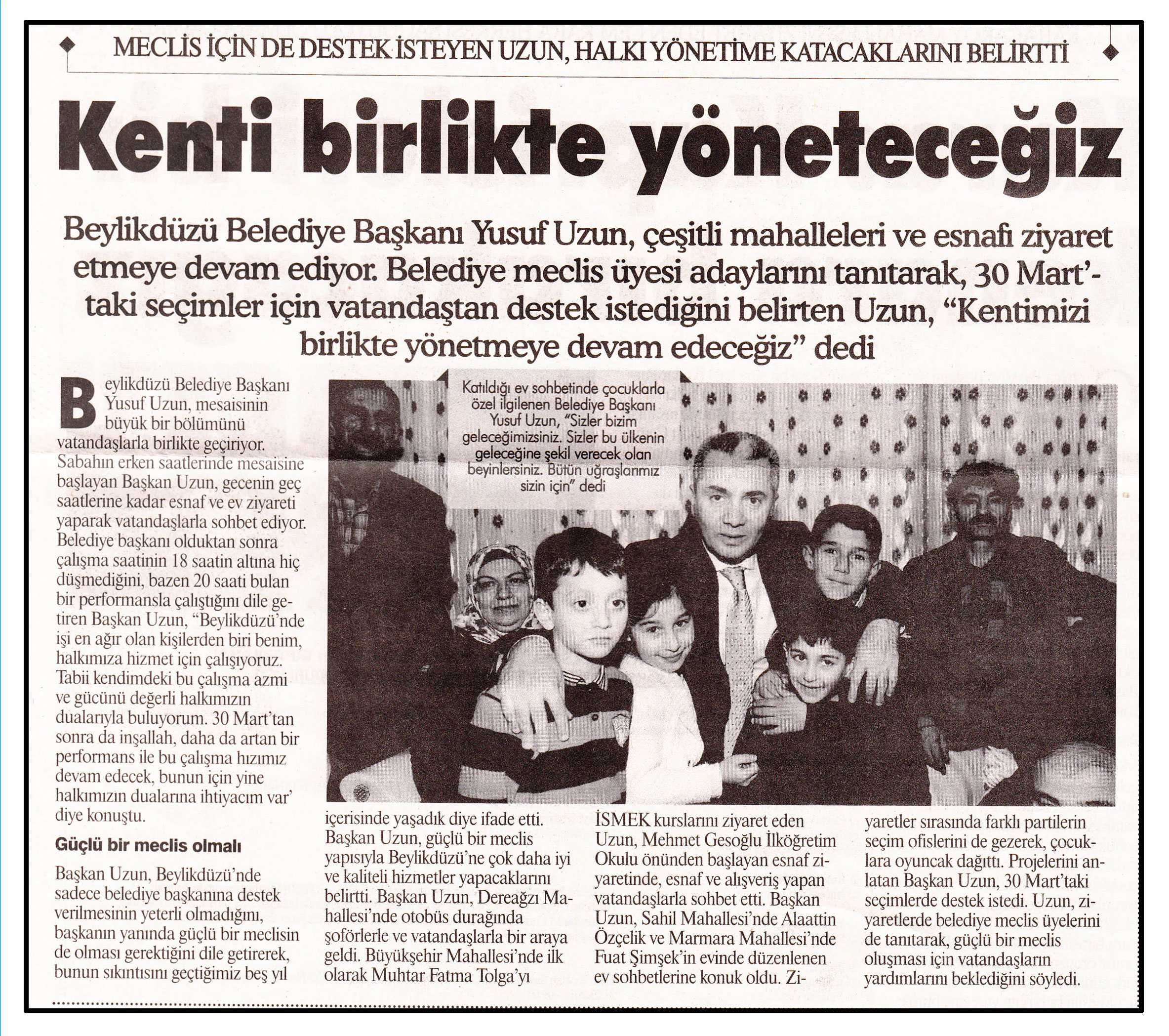 27 Şubat 2014 tarihli ''GAZETE İSTANBUL'' gazetesi. Beylikdüzü Belediye Başkanı Yusuf Uzun, çeşitli mahalleleri ve esnafı ziyaret etmeye devam ediyor. Belediye meclis üyesi adaylarını tanıtarak, 30 Mart'taki seçimler için vatandaştan destek istediğini belirten Uzun, ''Kentimizi birlikte yönetmeye devam edeceğiz'' dedi.
