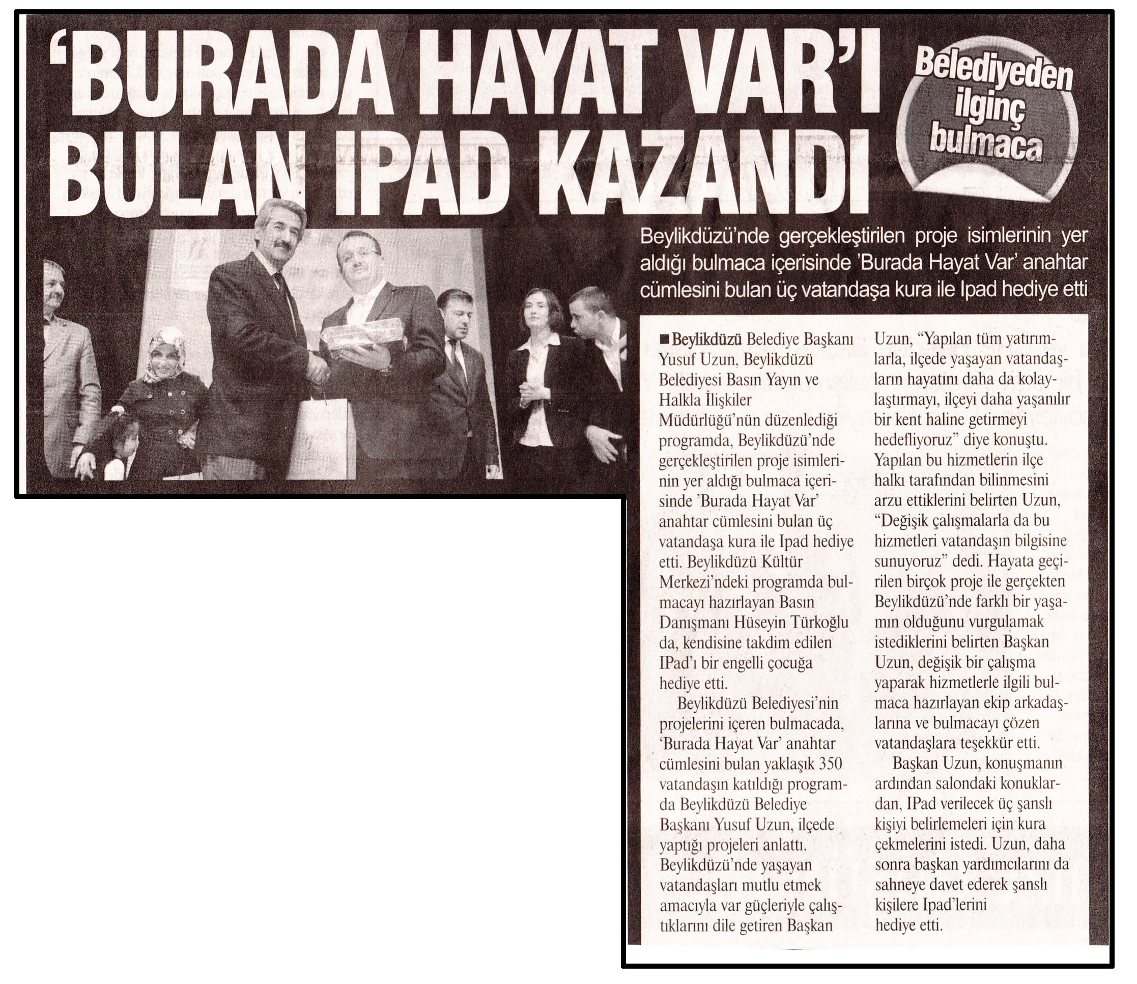 27 Şubat 2014 tarihli ''HABERDAR'' gazetesi. Beylikdüzü'nde gerçekleştirilen proje isimlerinin yer aldığı bulmaca içerisinde 'Burada Hayat Var' anahtar cümlesini bulan üç vatandaşa kura ile İpad hediye etti.