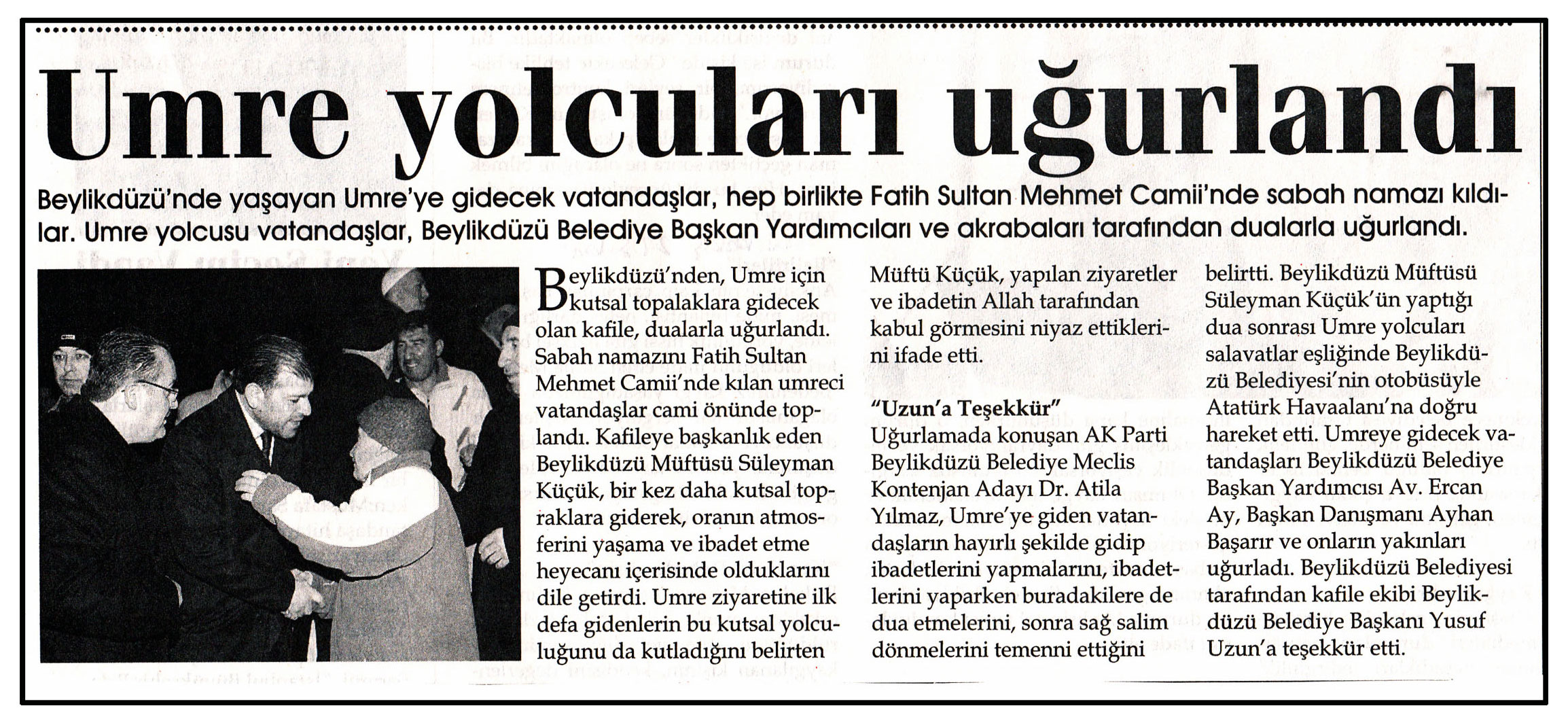 28 Şubat 2014 tarihli ''HÜRBAKIŞ'' gazetesi. Beylikdüzü'nde yaşayan Umre'ye gidecek vatandaşlar, hep birlikte Fatih Sultan Mehmet Camii'nde sabah namazı kıldılar. Umre yolcusu vatandaşlar, Beylikdüzü Belediye Başkan Yardımcıları ve akrabaları tarafından dualarla uğurlandı.