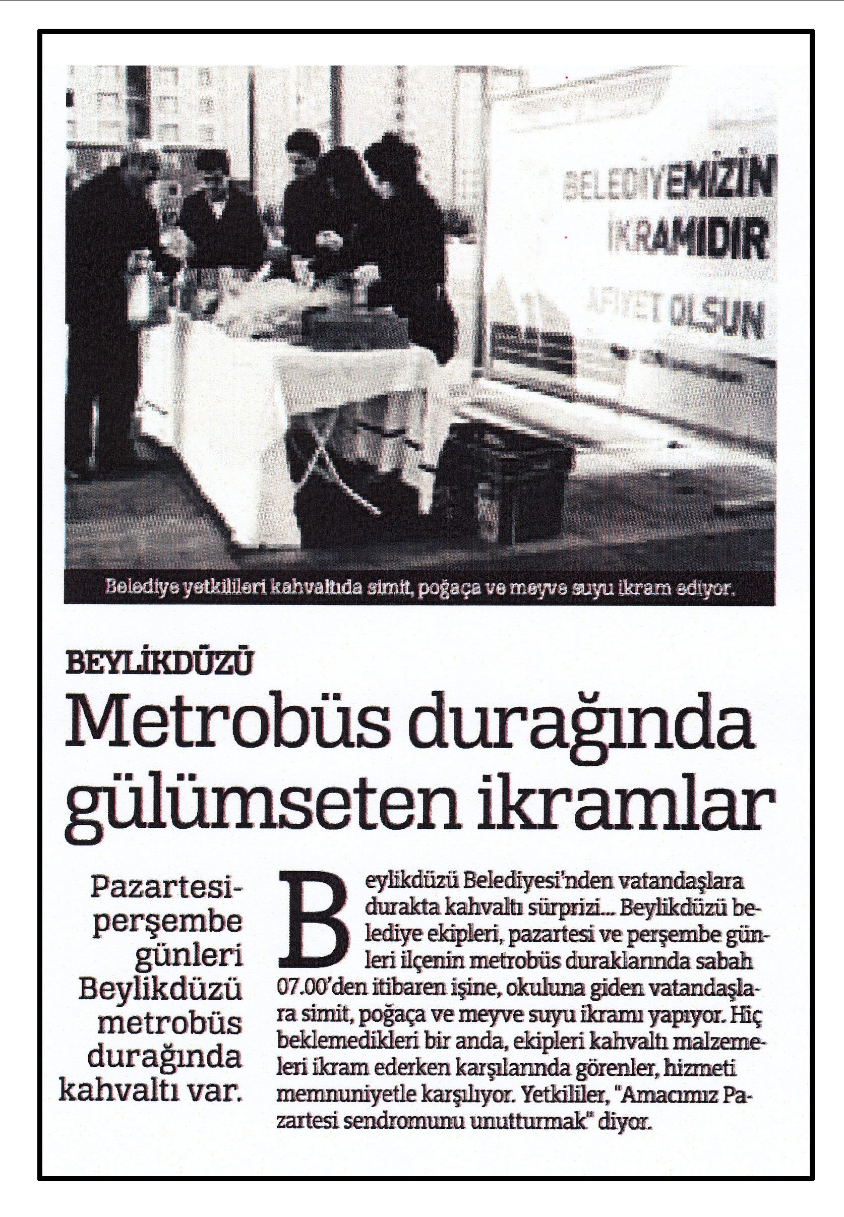 18 Şubat 2014 tarihli "TÜRKİYE" gazetesi. Beylikdüzü Belediyesi'nden vatandaşlara durakta kahvaltı sürprizi... Beylikdüzü belediye ekipleri, pazartesi ve perşembe günleri ilçenin metrobüs duraklarında sabah 07:00'den itibaren işine okuluna giden vatandaşlara simit,poğaça ve meyve suyu ikramı yapıyor.