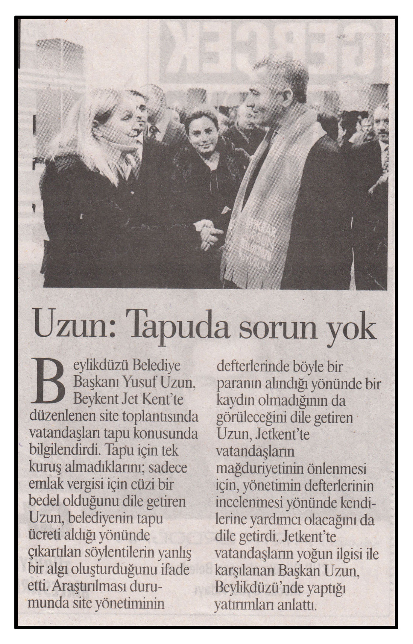 3 Mart 2014 tarihli "GERÇEK" gazetesi. Beylikdüzü Belediye Başkanı Yusuf Uzun, Beykent Jent Kent'te düzenlenen site toplantısında vatandaşları tapu konusunda bilgilendirdi. Tapu için tek kuruş almadıklarını; sadece emlak vergisi için cüzi bir bedel olduğunu dile getiren Uzun, belediyenin tapu ücreti aldığı yönünde çıkartılan söylentilerin yanlış bir algı oluşturduğunu ifade etti.