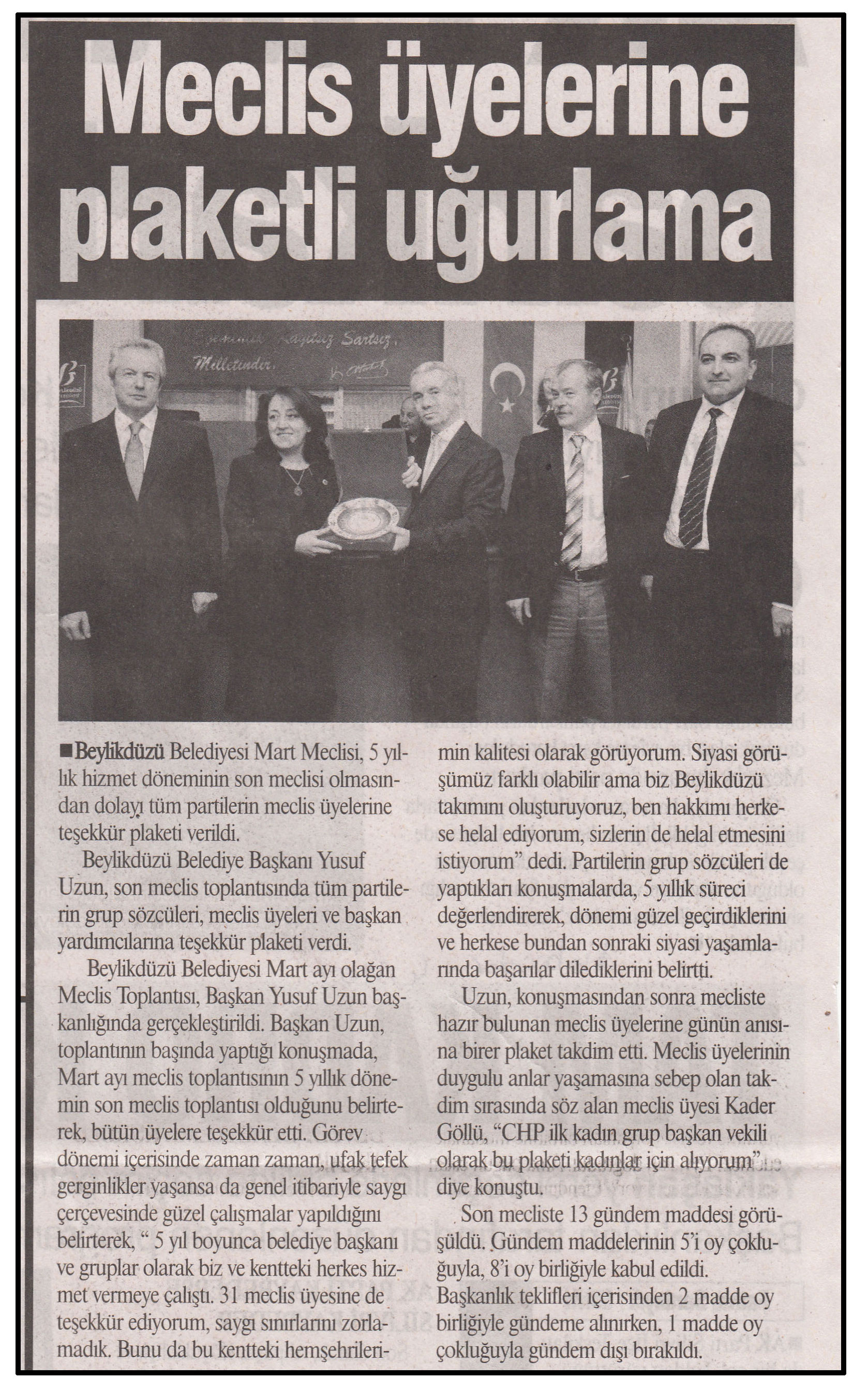 5 Mart 2014 tarihli "HABERDAR" gazetesi. Beylikdüzü Belediye Başkanı Yusuf Uzun, 5 yıllık hizmet döneminin son meclisi olmasından dolayı tüm partilerin grup sözcüleri, meclis üyeleri ve başkan yardımcılarına teşekkür plaketi verdi.