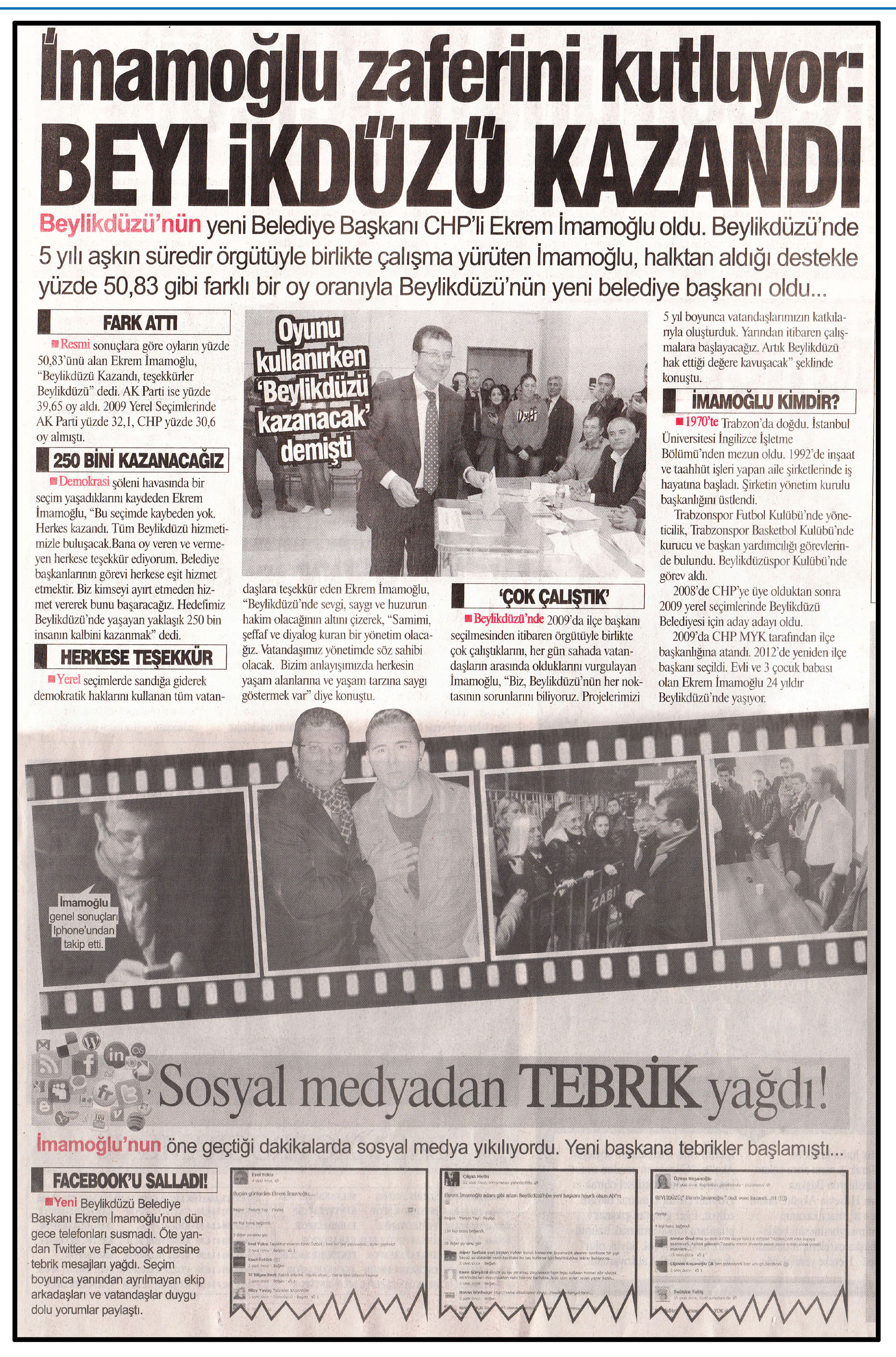 1 Nisan 2014 tarihli "HABERDAR" gazetesi. Beylikdüzü'nün yeni Belediye Başkanı CHP'li Ekrem İmamoğlu oldu. Beylikdüzü'nde 5yılı aşkın süredir örgütüyle birlikte çalışma yürüten İmamoğlu, halktan aldığı destekle yüzde 50,83 gibi farklı bir oy oranıyla Beylikdüzü'nün yeni belediye başkanı oldu.