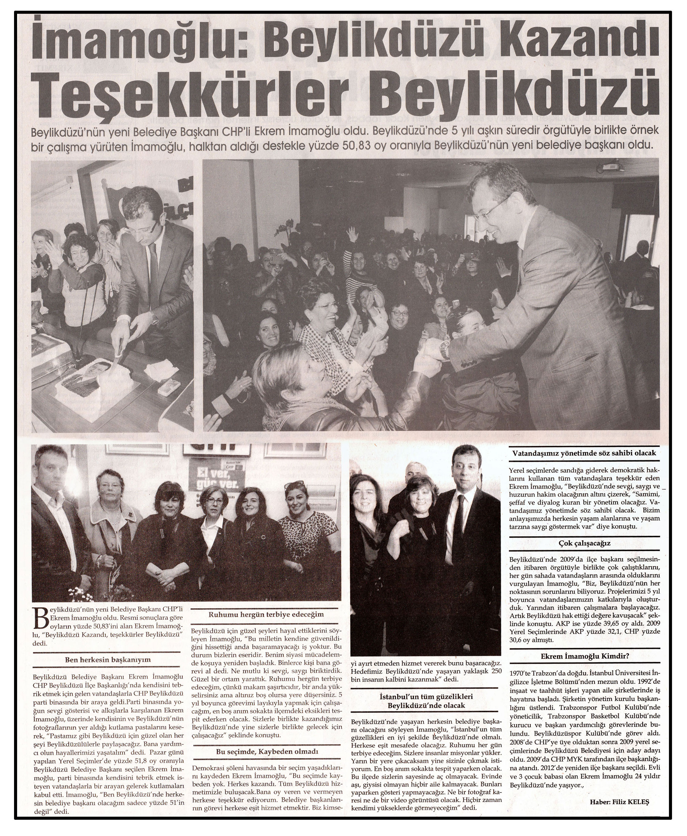 3 Nisan 2014 tarihli "HÜRBAKIŞ" gazetesi. Beylikdüzü'nün yeni Belediye Başkanı CHP'li Ekrem İmamoğlu oldu. Beylikdüzü'nde 5 yılı aşkın süredir örgütüyle birlikte örnek bir çalışma yürüten İmamoğlu, halktan aldığı destekle yüzde 50.83 oy oranıyla Beylikdüzü'nün yeni belediye başkanı oldu.
