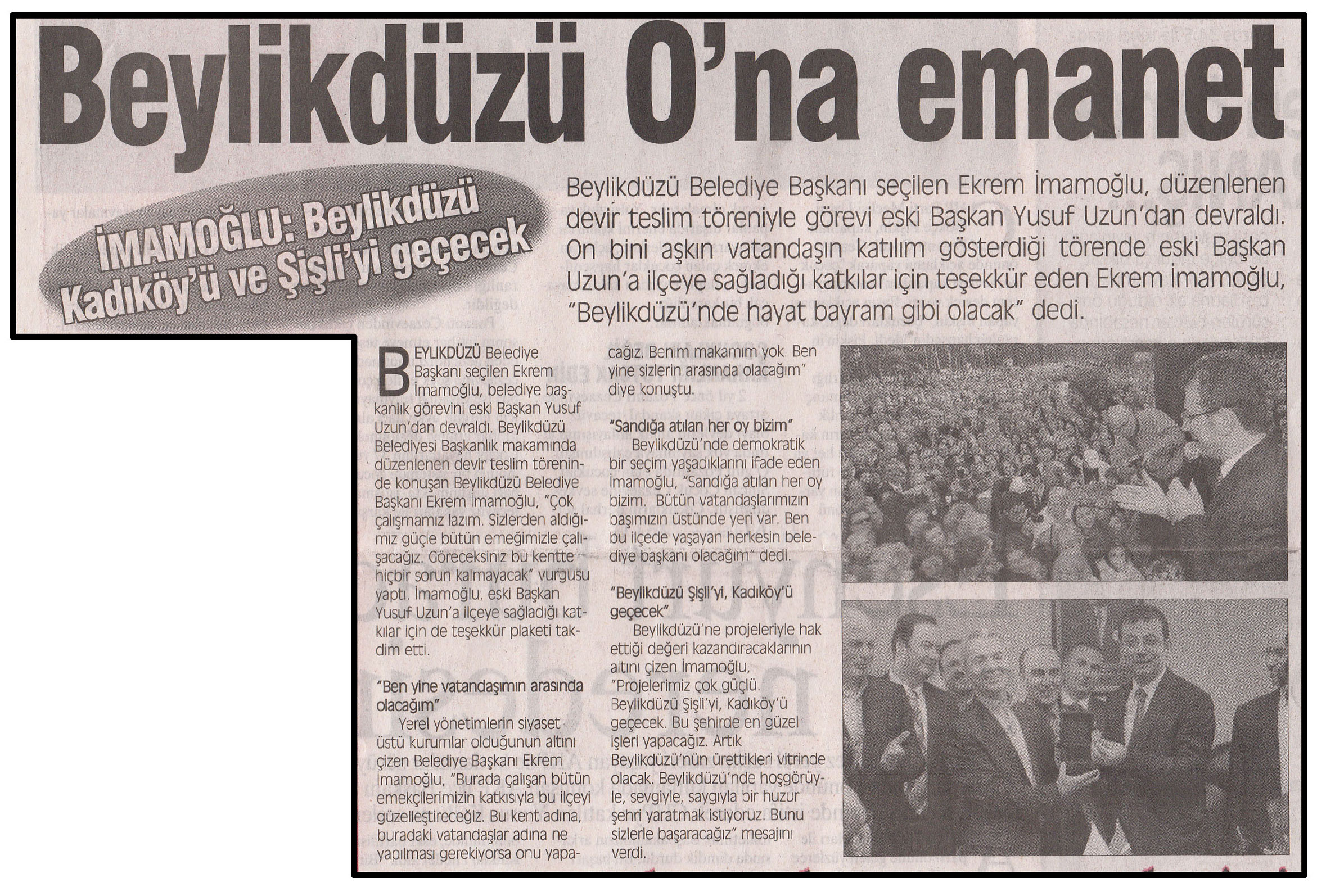 4 Nisan 2014 tarihli "DEĞİŞİM" gazetesi. Beylikdüzü Belediye Başkanı seçilen Ekrem İmamoğlu, düzenlenen devir teslim töreniyle görevi eski Başkan Yusuf Uzun'dan devraldı.