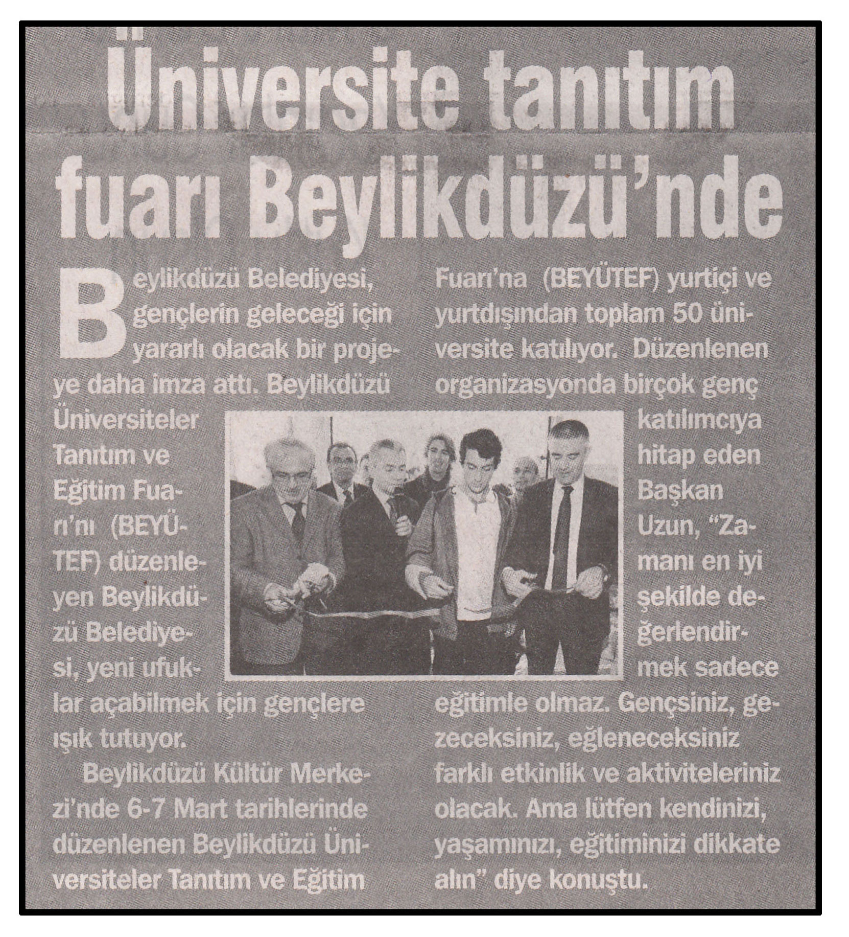 7 Mart 2014 tarihli "DEĞİŞİM" gazetesi. Beylikdüzü Belediyesi, gençlerin geleceği için yararlı olacak bir projeye daha imza attı. Beylikdüzü Üniversiteler Tanıtım ve Eğitim Fuarı'nı düzenleyen Beylikdüzü Belediyesi, yeni ufuklar açabilmek için gençlere ışık tutuyor.