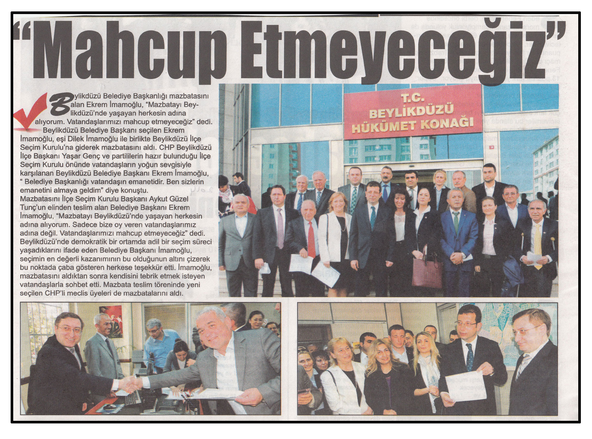 7 Nisan 2014 tarihli "BEYLİKDÜZÜ" gazetesi. Beylikdüzü Belediye Başkanlığı mazbatasını alan Ekrem İmamoğlu, "Mazbatayı Beylikdüzü'nde yaşayan herkesin adına alıyorum. Vatandaşlarımı mahcup etmeyeceğiz" dedi.