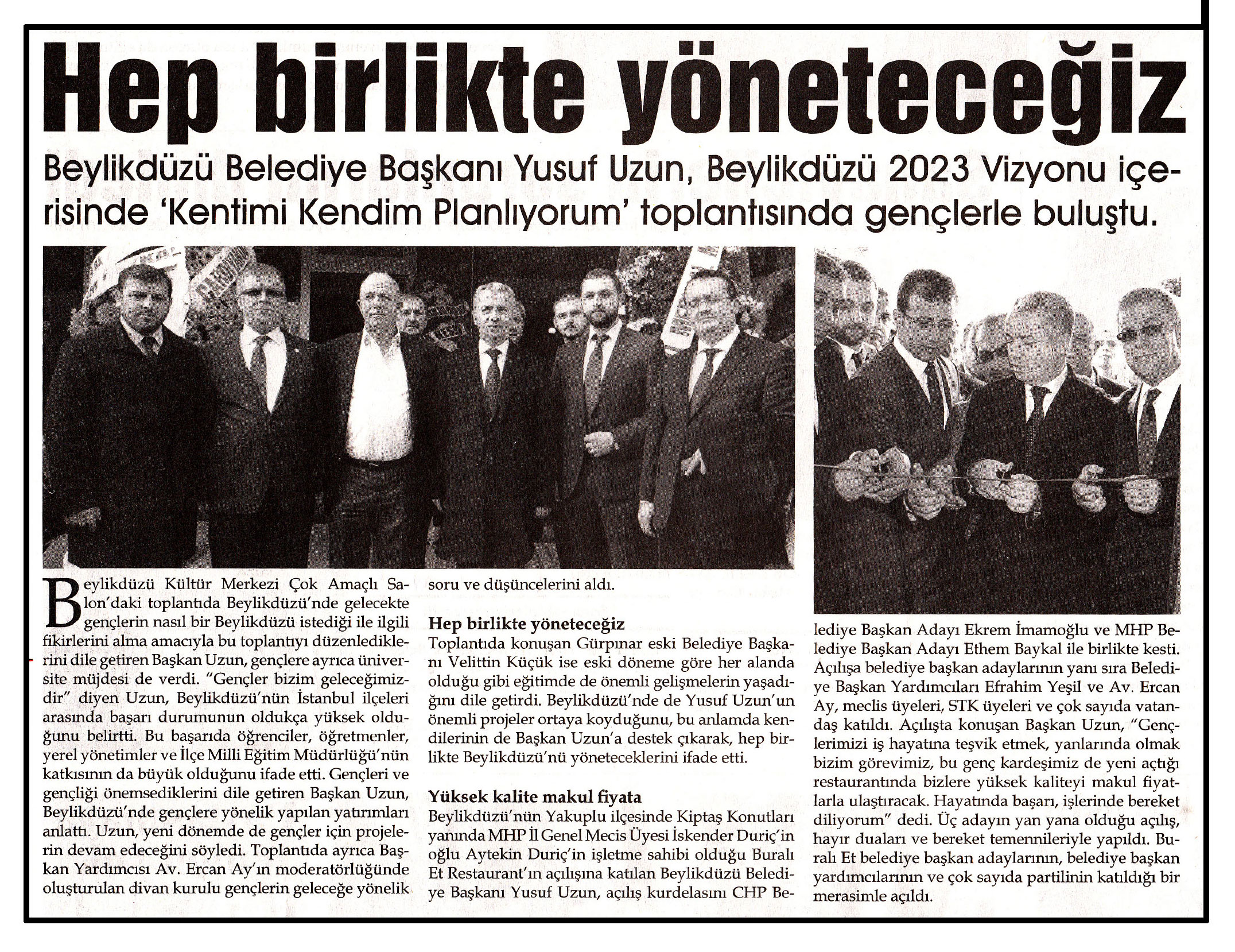 10 Mart 2014 tarihli "HÜRBAKIŞ" gazetesi. Beylikdüzü Belediye Başkanı Yusuf Uzun, Beylikdüzü 2023 Vizyonu içerisinde " Kentimi Kendim Planlıyorum" toplantısında gençlerle buluştu. Beylikdüzü Kültür Merkezi Çok Amaçlı Salon'daki toplantıda Beylikdüzü'nde gelecekte gençlerin nasıl bir Beylikdüzü istediği ile ilgili fikirlerini alma amacıyla bu toplantıyı düzenlediklerini dile getiren Başkan Uzun, gençlere ayrıca üniversite müjdesi de verdi