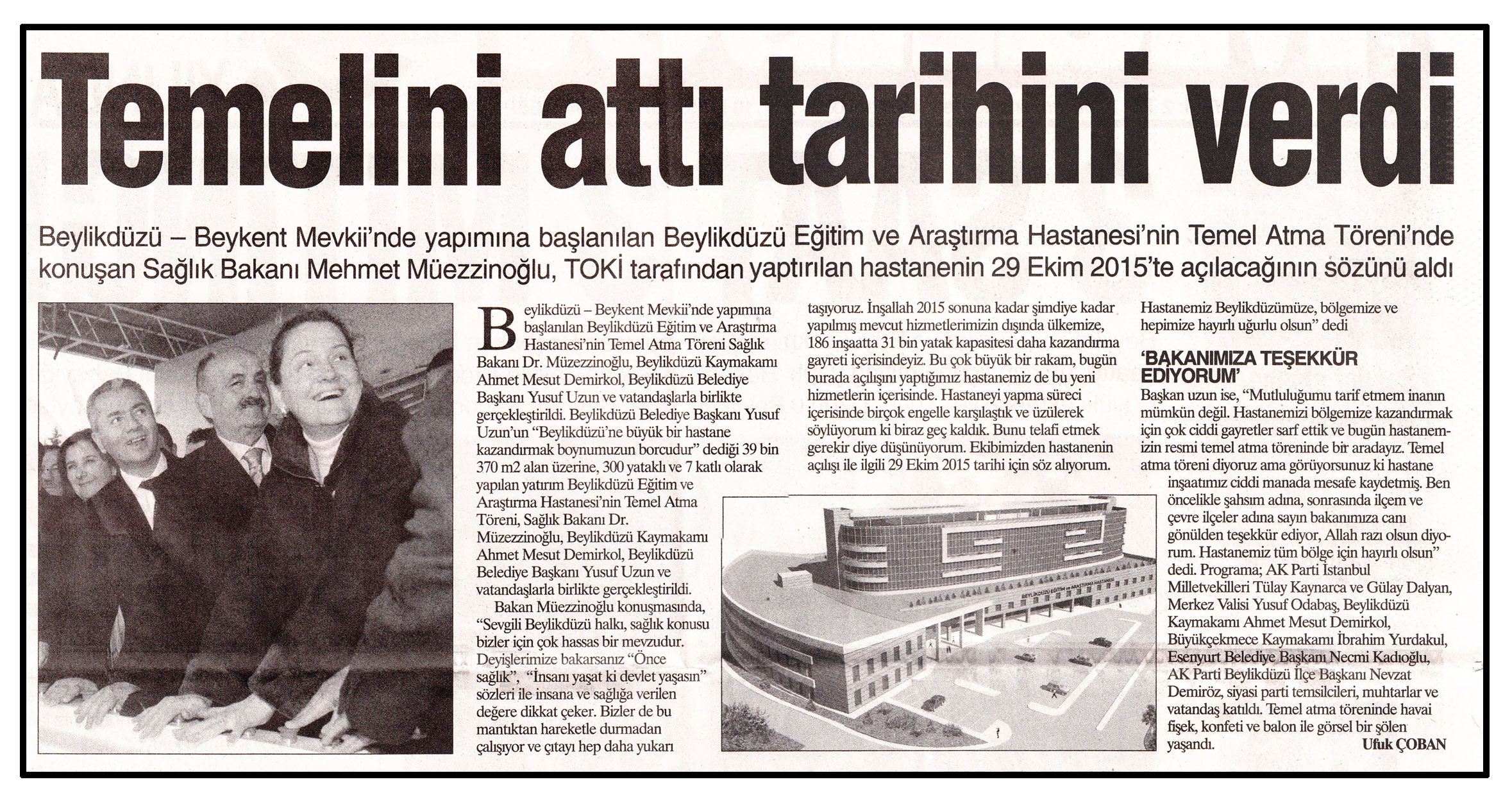 10 Mart 2014 tarihli "MANŞET" gazetesi. Beylikdüzü - Beykent Mevkii'nde yapımına başlanılan Beylikdüzü Eğitim ve Araştırma Hastanesi'nin Temel Atma Töreni'nde konuşan Sağlık Bakanı Mehmet Müezzinoğlu, TOKİ tarafından yaptırılan hastanenin 29 Ekim 2015'te açılacağının sözünü aldı.