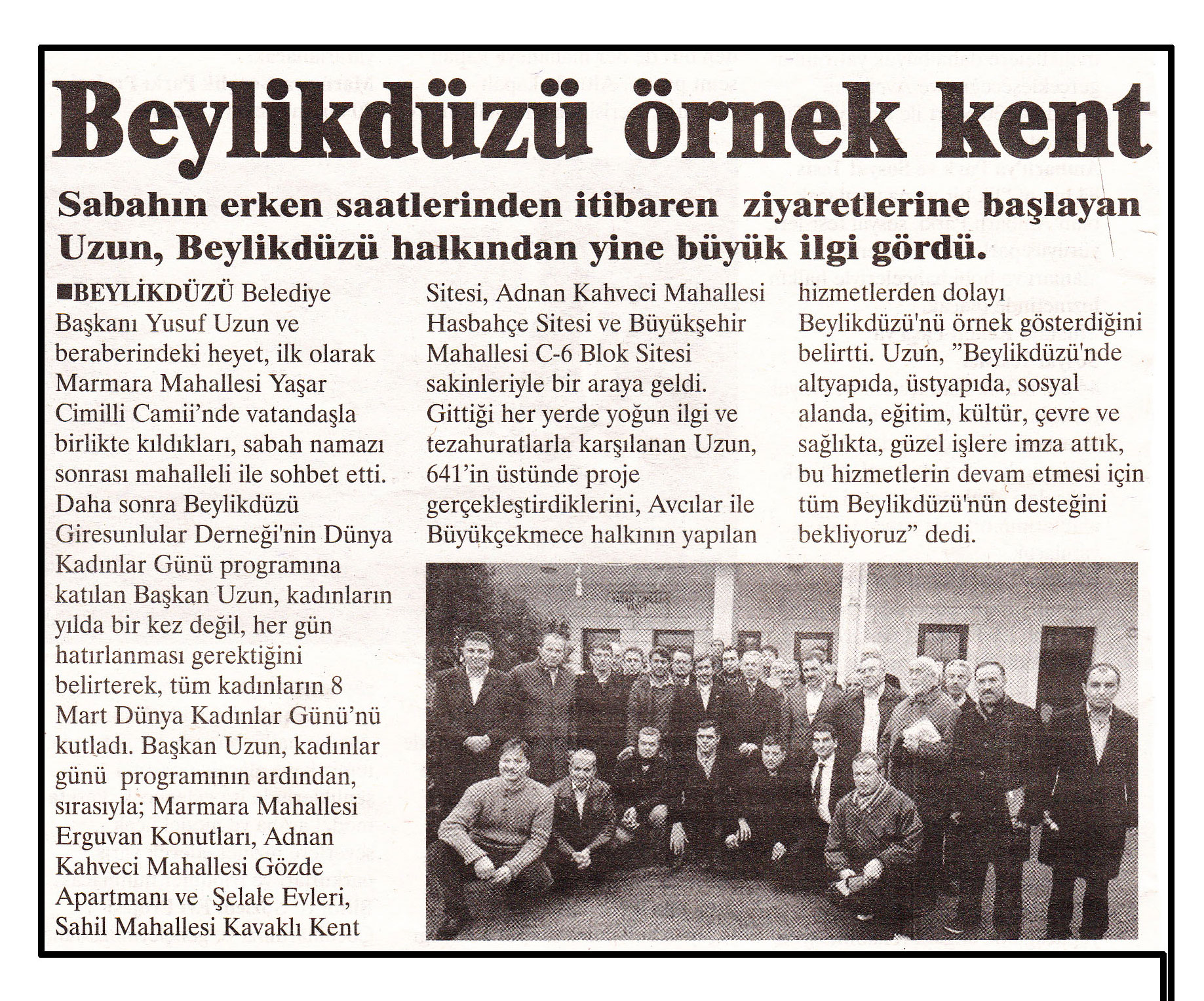 19 Mart 2014 tarihli "ANAHTAR" gazetesi. Sabahın erken saatlerinde itibaren ziyaretlerine başlayan Uzun, Beylikdüzü halkından yine büyük ilgi gördü. Beylikdüzü Belediye Başkanı Yusuf Uzun ve beraberindeki heyet, ilk olarak Marmara Mahallesi Yaşar Cimilli Camii'nde vatandaşla birlikte kıldıkları, sabah namazı sonrası mahalleli ile sohbet etti.