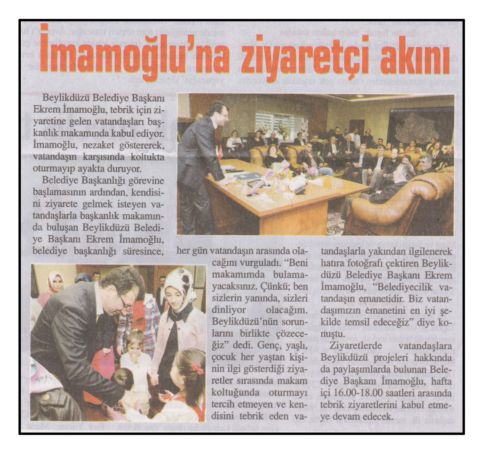 17 Nisan 2014 tarihli "BİZİMYAŞAM" gazetesi. Beylikdüzü Belediye Başkanı Ekrem İmamoğlu, tebrik için ziyaretine gelen vatandaşları başkanlık makamında kabul ediyor. İmamoğlu, nezaket göstererek, vatandaşın karşısında koltukta oturmayıp ayakta duruyor.