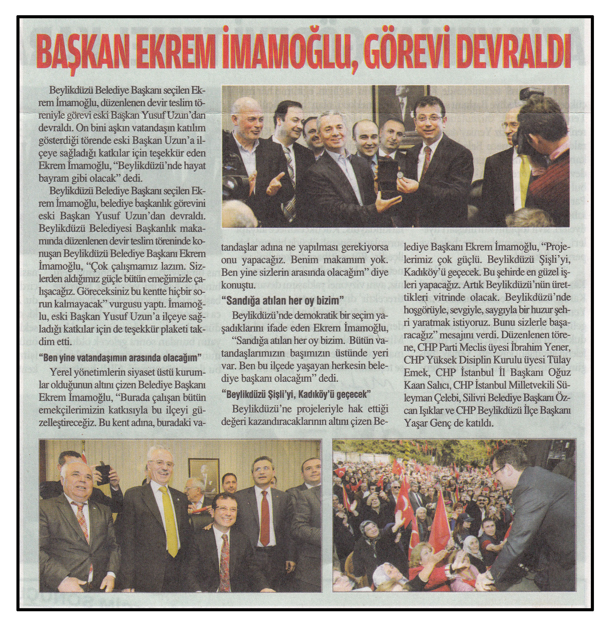 21. Nisan 2014tarihli "YEREL HABER" gazetesi. Beylikdüzü Belediye Başkanı seçilen Ekrem İmamoğlu, düzenlenen devir teslim töreniyle görevi eski Başkan Yusuf Uzun'dan devraldı.
