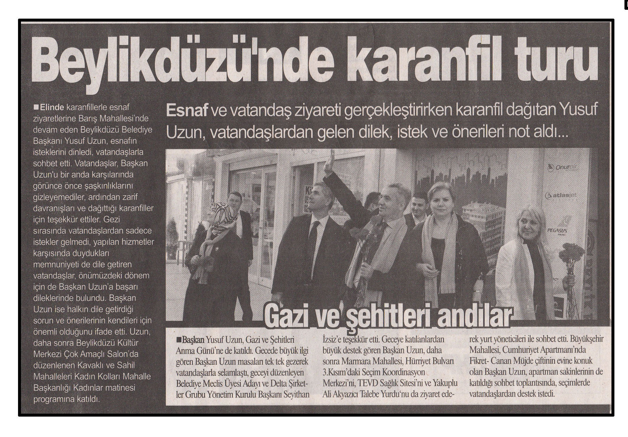 25 Mart 2014 tarihli "HABERDAR" gazetesi. Esnaf ve vatandaş ziyareti gerçekleştirirken karanfil dağıtan Yusuf Uzun, vatandaşlardan gelen dilek, istek ve önerileri not aldı.