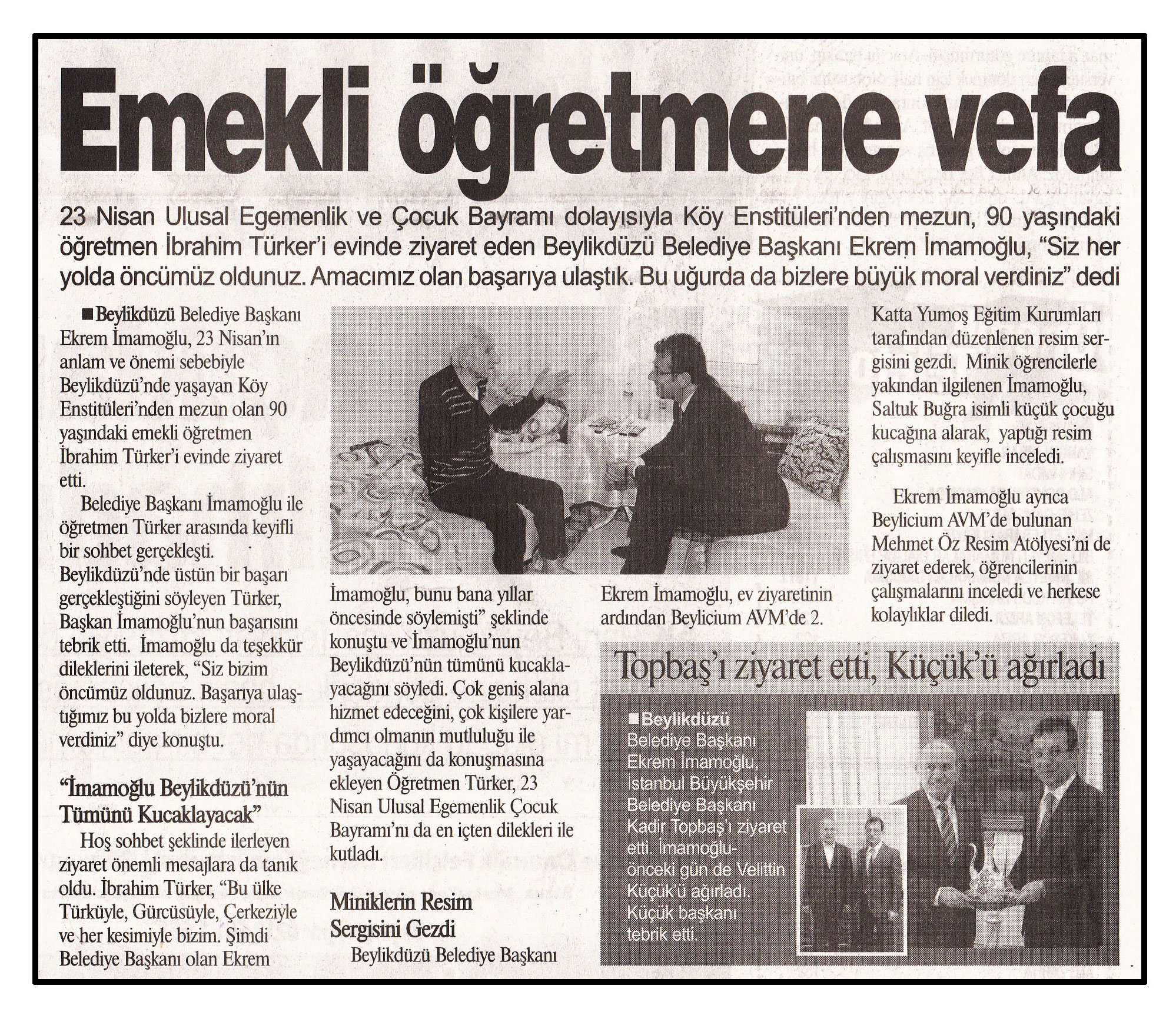 25 Nisan 2014 tarihli "HABERDAR" gazetesi. 23 Nisan Ulusal Egemenlik ve Çocuk Bayramı dolayısıyla Köy Enstitüleri'nden mezun, 90 yaşındaki öğretmen İbrahim Türker'i evinde ziyaret eden Beylikdüzü Belediye Başkanı Ekrem İmamoğlu, "Siz her yolda öncümüz oldunuz. Amacımız olan başarıya ulaştık. Bu uğurda da bizlere büyük moral verdiniz" dedi.