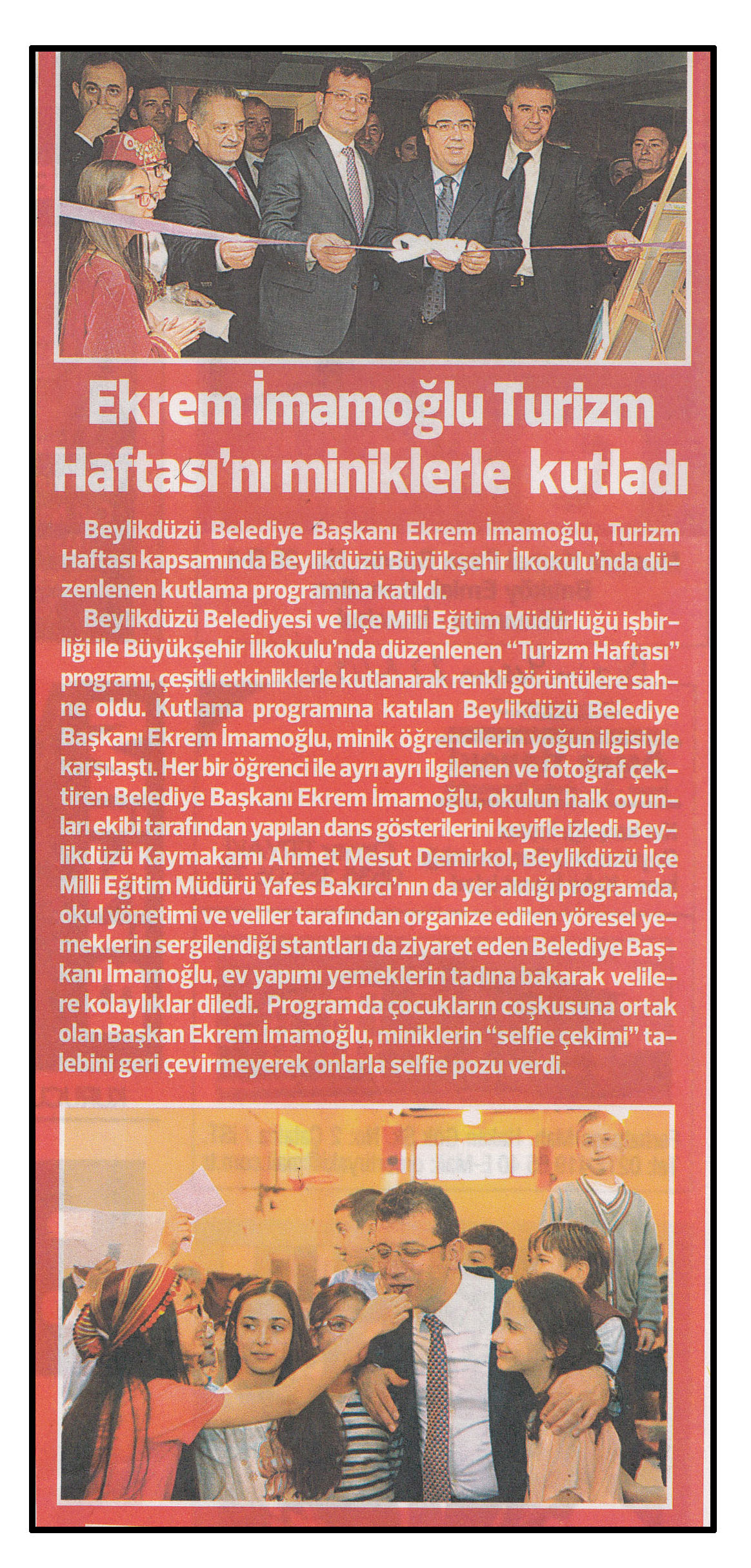 29 Nisan 2014 tarihli "BİZİMYAŞAM" gazetesi. Beylikdüzü Belediye Başkanı Ekrem İmamoğlu, Turizm Haftası kapsamında Beylikdüzü Büyükşehir İlkokulu'nda düzenlenen kutlama programına katıldı.