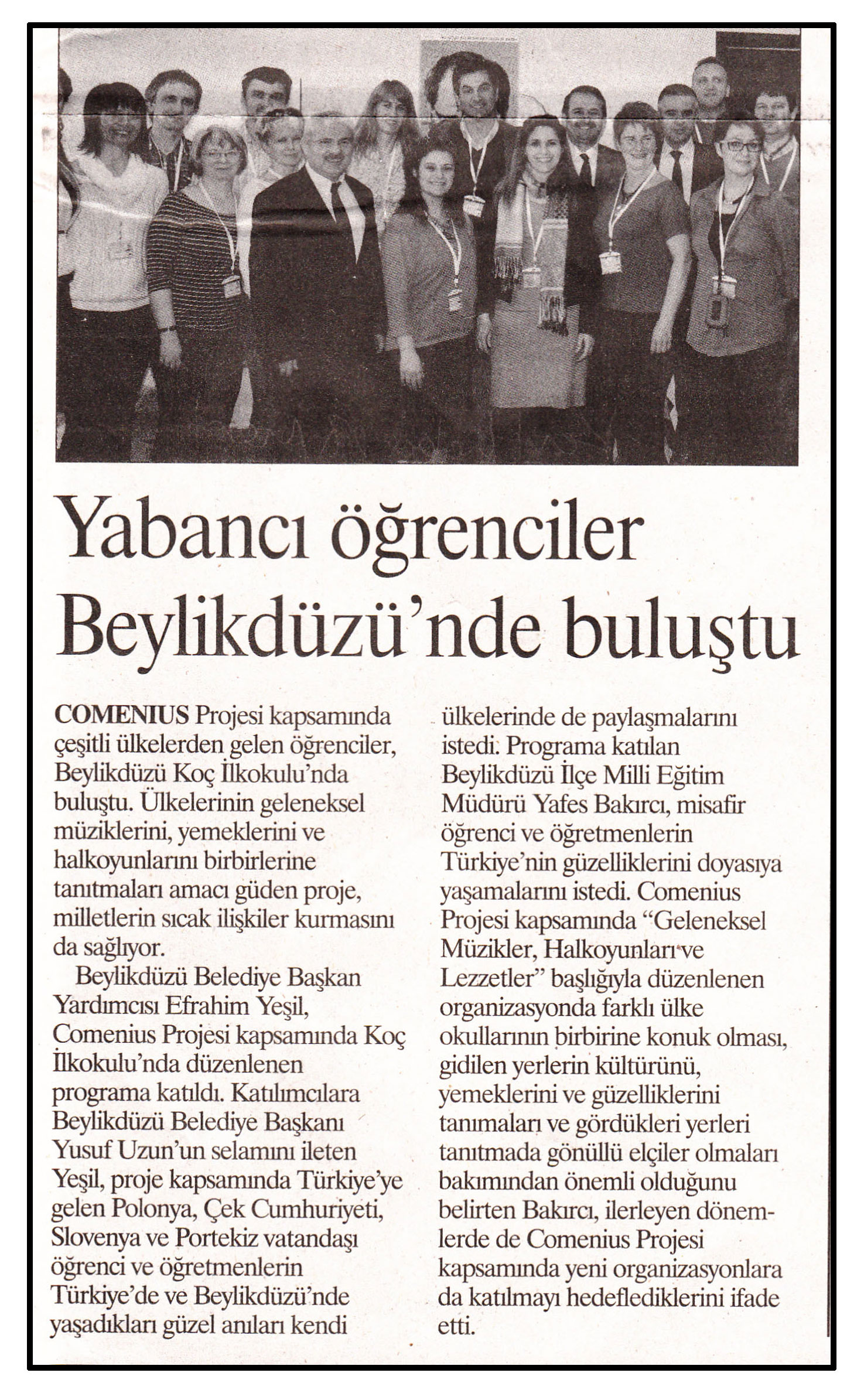 28 Mart 2014 tarihli "KENTHABER" gazetesi. Comenius Projesi kapsamında çeşitli ülkelerden gelen öğrenciler, Beylikdüzü Koç İlkokulu'nda buluştu. Ülkelerinin geleneksel müziklerini, yemeklerini ve halkoyunlarını birbirlerine tanıtmaları amacı güden proje, milletlerin sıcak ilişkiler kurmasını da sağlıyor.