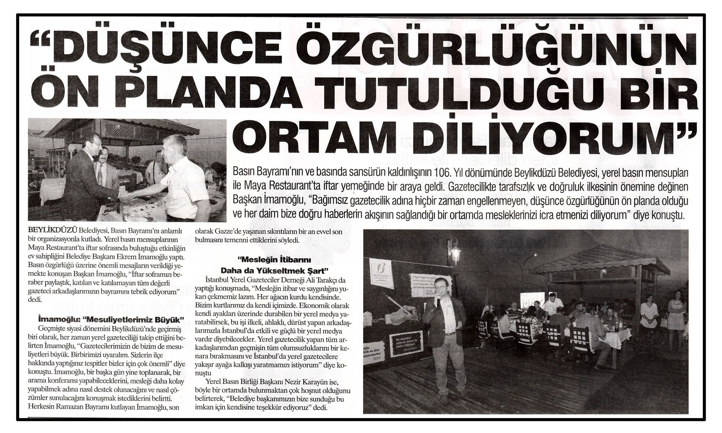 1 Ağustos 2014 tarihli "HABERCİ" gazetesi. Basın Bayramı'nın ve basında sansürün kaldırılışının 106. Yıl dönümünde Beylikdüzü Belediyesi, yerel basın mensupları ile Maya Restaurant'ta iftar yemeğinde bir araya geldi.