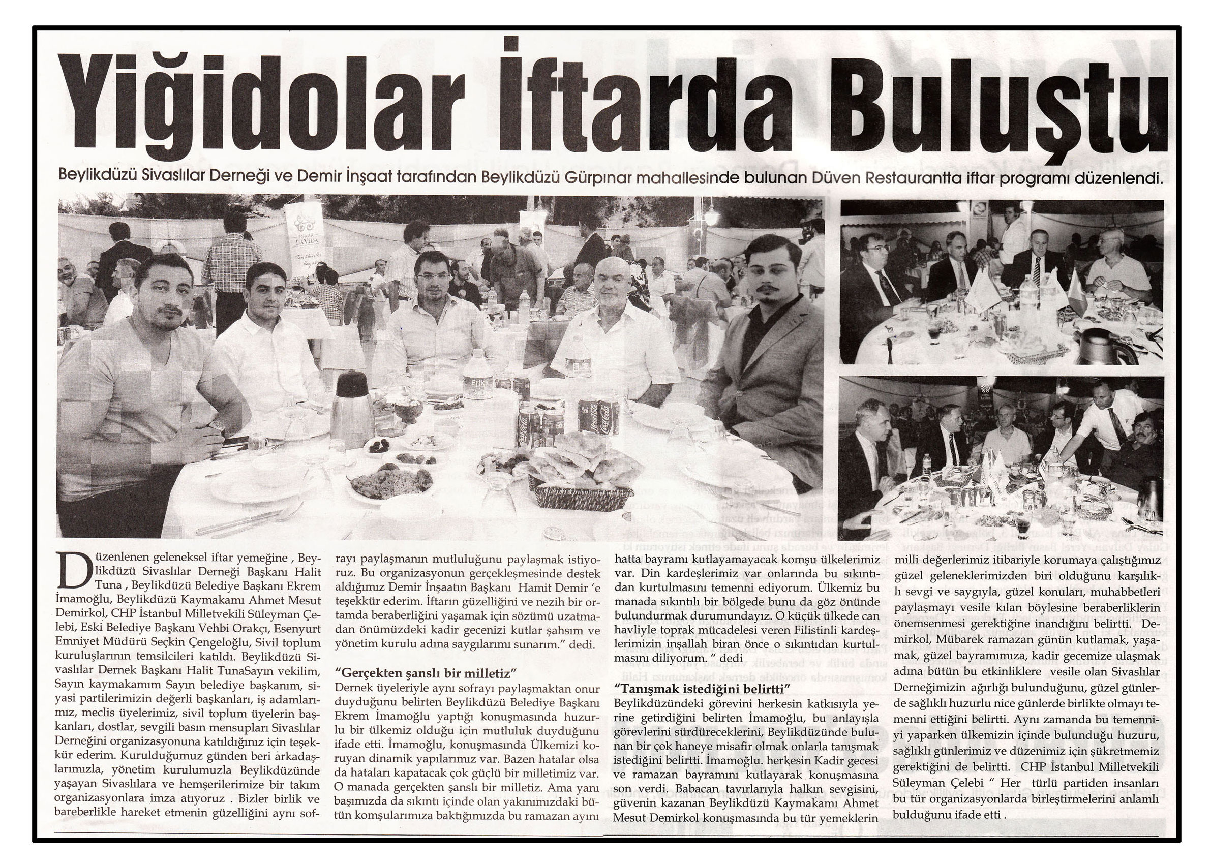 1 Ağustos 2014 tarihli "Hürbakış" gazetesi. Beylikdüzü Sivaslılar Derneği ve Demir İnşaat tarafından Beylikdüzü Gürpınar mahallesinde bulunan Düven Restaurantta iftar programı düzenledi.