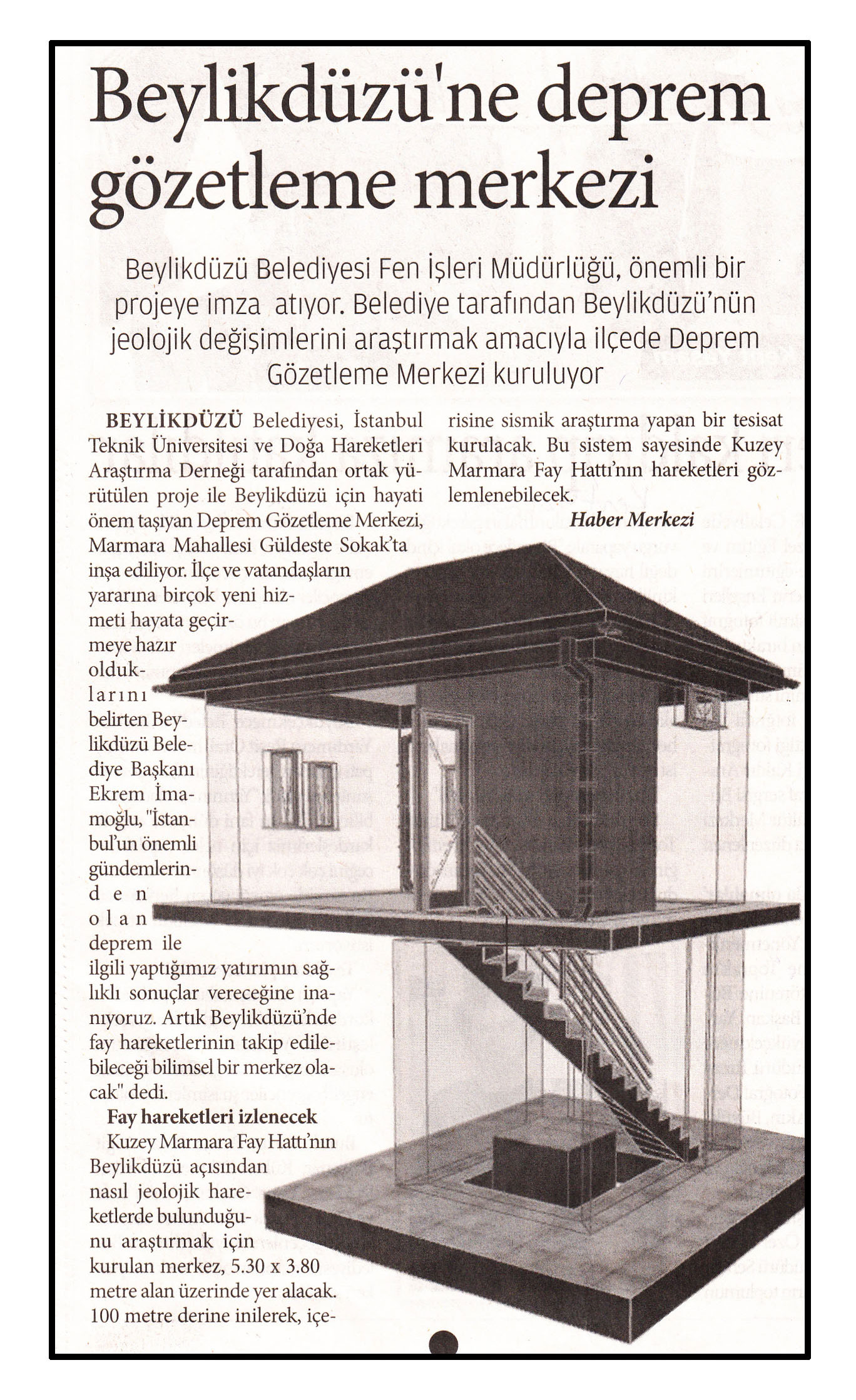 2 Mayıs 2015 tarihli "KENT YAŞAM" gazetesi. Beylikdüzü Belediyesi Fen İşleri Müdürlüğü, önemli bir projeye imza atıyor. Belediye tarafından Beylikdüzü'nün jeolojik değişimlerini araştırmak amacıyla ilçede Deprem Gözetleme Merkezi kuruluyor.