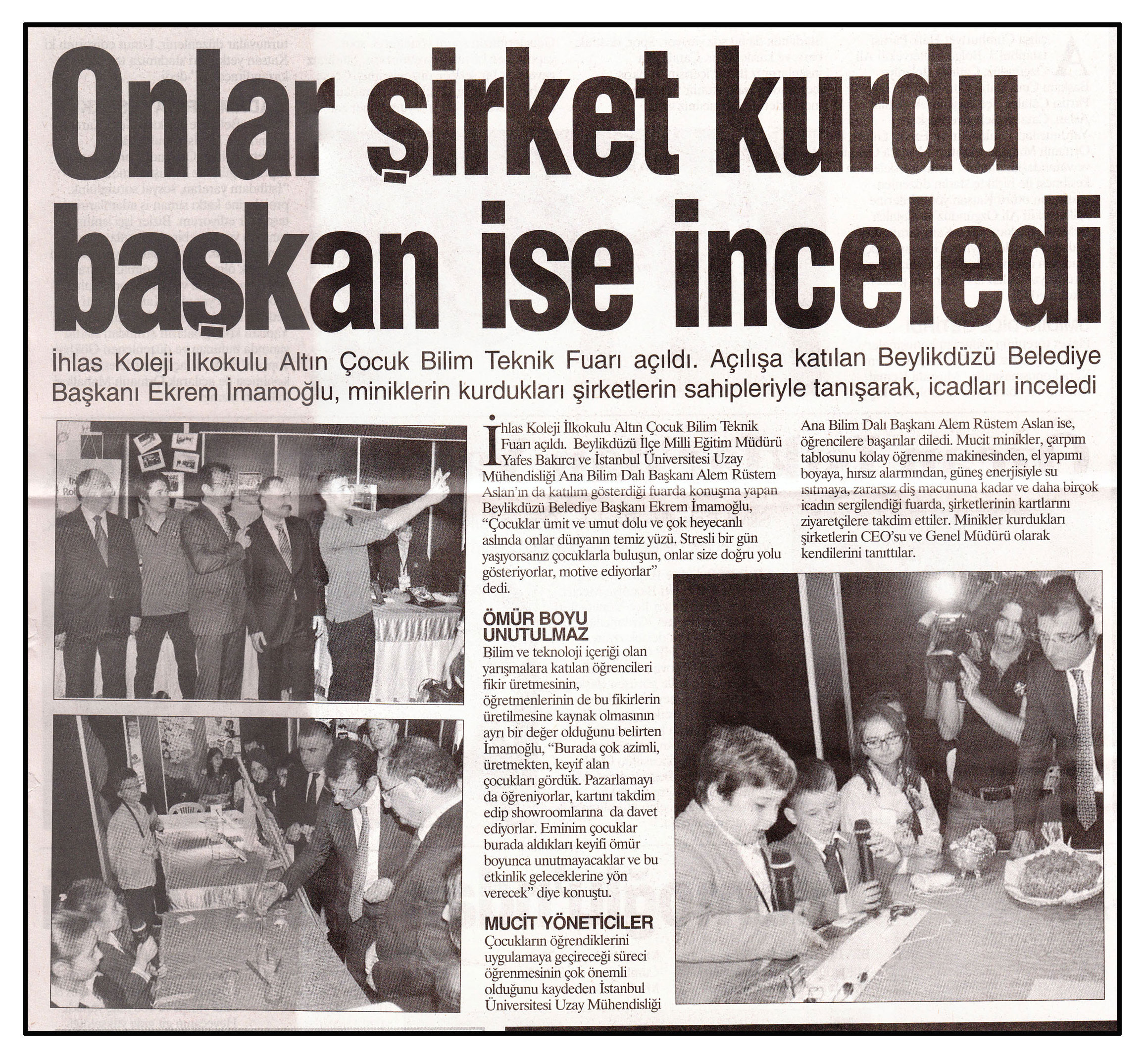 2 Haziran 2014 tarihli "MANŞET" gazetesi. İhlas Koleji İlkokulu Altın Çocuk Bilim Teknik Fuarı açıldı. Açılışa katılan Beylikdüzü Belediye Başkanı Ekrem İmamoğlu, miniklerin kurdukları şirketlerin sahipleriyle tanışarak, icadları inceledi.