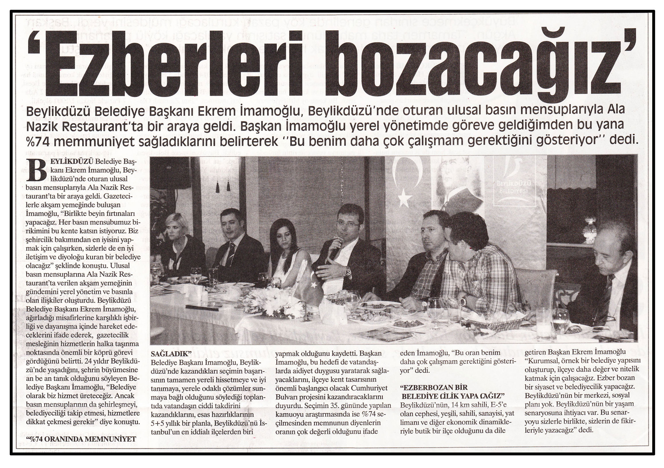 3 Haziran 2014 tarihli "YENİ GÜN" gazetesi. Beylikdüzü Belediye Başkanı Ekrem İmamoğlu, Beylikdüzü'nde oturan ulusal basın mensuplarıyla Ala Nazik Restaurant'ta bir araya geldi.