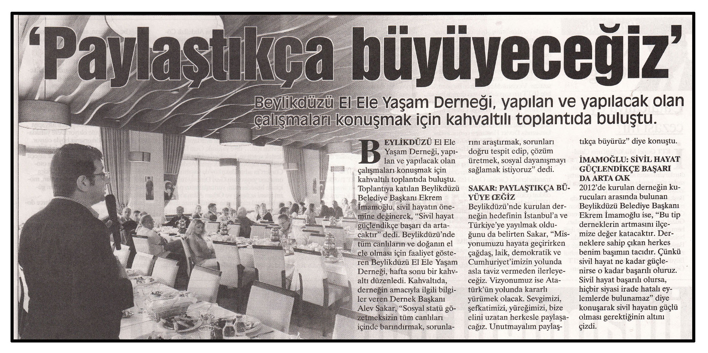 3 Haziran 2014 tarihli "YENİ GÜN" gazetesi. Beylikdüzü El Ele Yaşam Derneği, yapılan ve yapılacak lan çalışmaları konuşmak için kahvaltılı toplantıda buluştu.