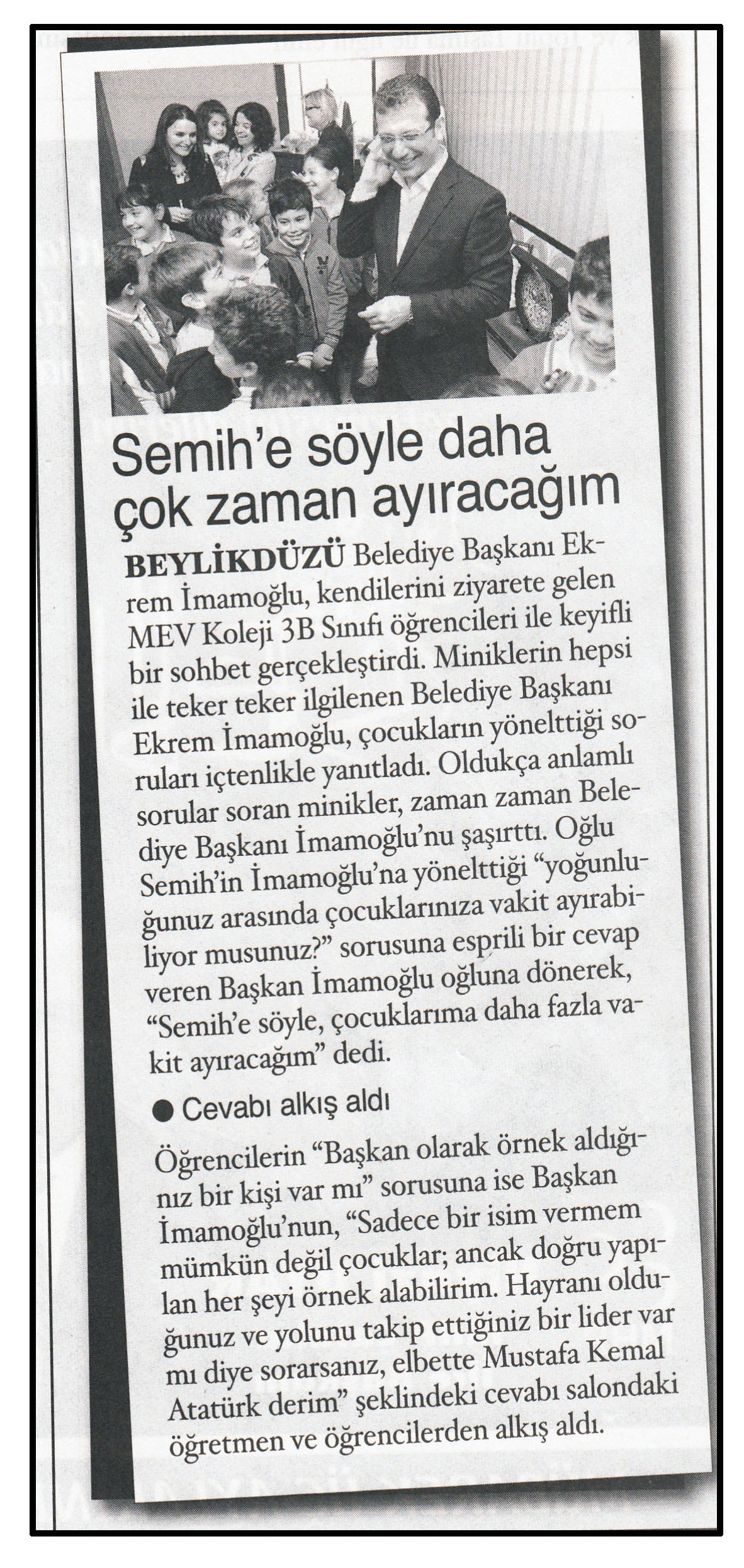 6 Mayıs 2014 tarihli "YÖREM" gazetesi. Beylikdüzü Belediye Başkanı Ekrem İmamoğlu, kendilerini ziyarete gelen MEV Koleji 3B Sınıfı öğrencileri ile keyifli bir sohbet gerçekleştirdi. Oldukça anlamlı sorular soran minikler, zaman zaman Belediye Başkanı İmamoğlu'nu şaşırttı. Oğlu Semih'in İmamoğlu'na yönelttiği "yoğunluğunuz arasında çocuklarınıza vakit ayırabiliyor musunuz? sorusuna esprili bir cevap veren Başkan İmamoğlu oğluna dönerek, " Semih'e söyle, çocuklarıma daha fazla vakit ayıracağım" dedi.