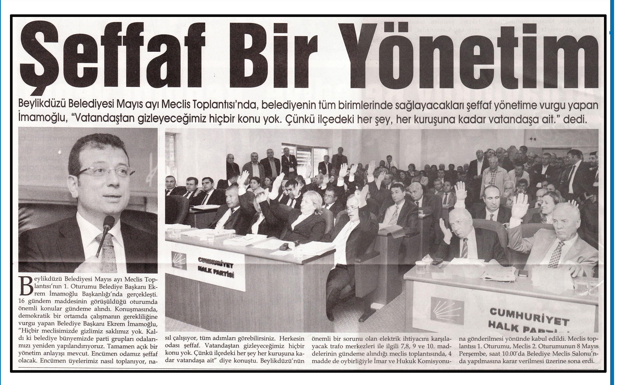 7 Mayıs 2014 tarihli "HÜRBAKIŞ" gazetesi. Beylikdüzü Belediyesi Mayıs ayı Meclis Toplantısı'nda, belediyenin tüm birimlerinde sağlayacakları şeffaf yönetime vurgu yapan İmamoğlu, "Vatandaştan gizleyeceğimiz hiçbir konu yok çünkü ilçedeki herşey, her kuruşuna kadar vatandaşa ait" dedi.