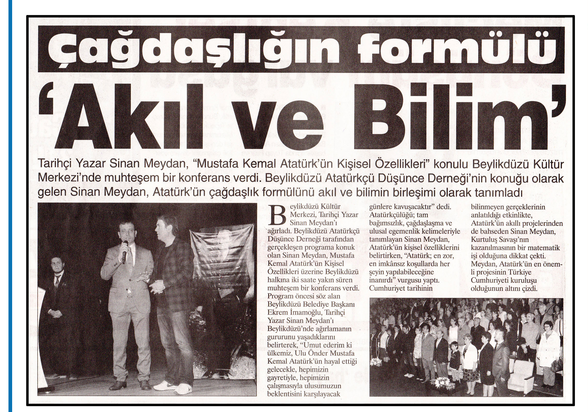 7 Mayıs 2014 tarihli " MANŞET" gazetesi. Tarihçi Yazar Sinan Meydan, " Mustafa Kemal Atattürk'ün Kişisel Özellikleri" konulu Beylikdüzü Kültür Merkezi'nde muhteşem bir onferans verdi. Beylikdüzü Atatürkçü Düşünce Derneği'nin konuğu olarak gelen Sinan Meydan, Atatürk'ün çağdaşlık formülünü akıl ve bilimin birleşimi olarak tanımladı.