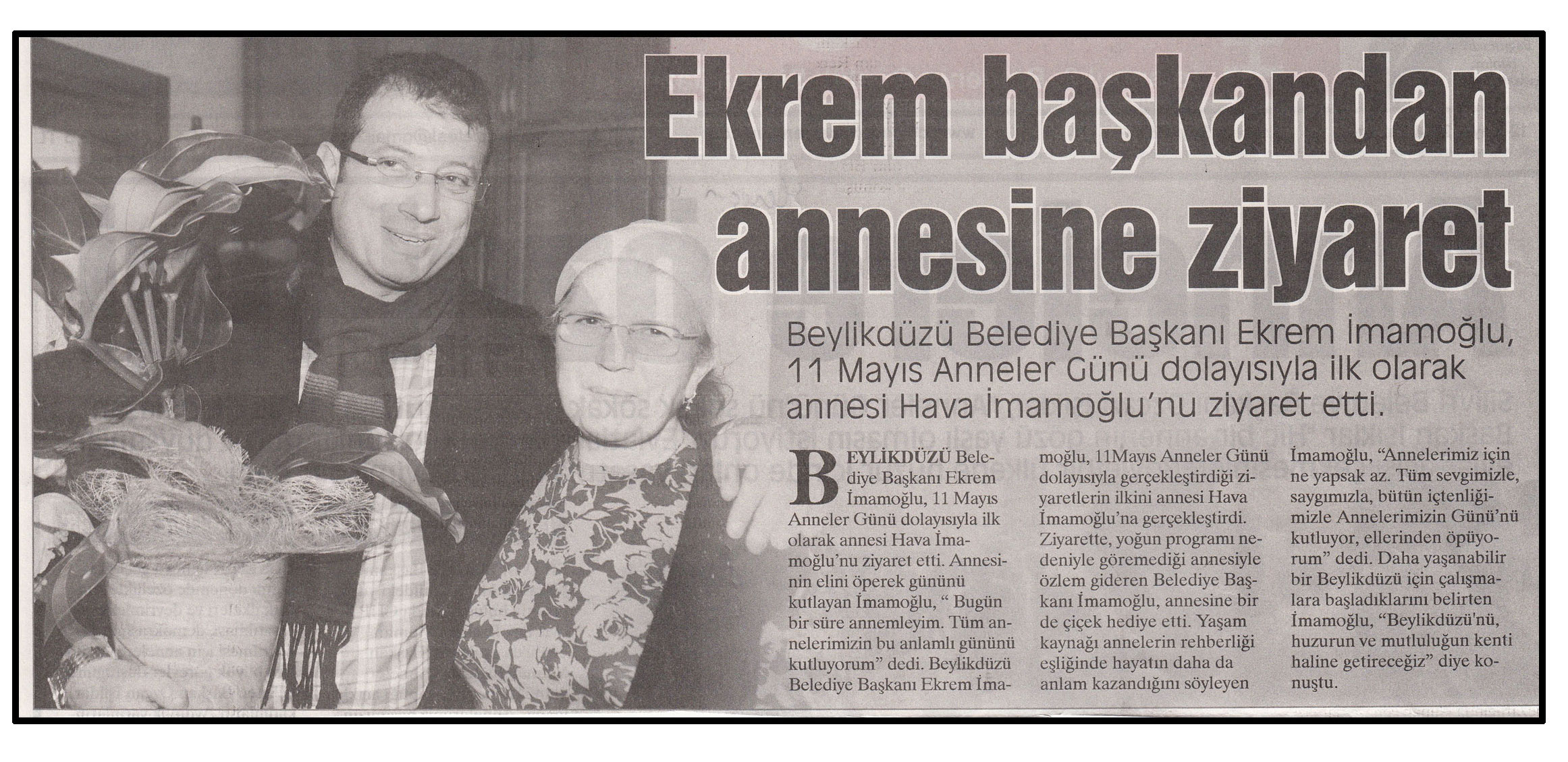 12 Mayıs 2014 tarihli "YENİ GÜN" gazetesi. Beylikdüzü Belediye Başkanı Ekrem İmamoğlu, 11 Mayıs Anneler Günü dolayısıyla ilk olarak annesi Havva İmamoğlu'nu ziyaret etti. Annesinin elini öperek gününü kutlayan İmamoğlu, " Bugün bir sürü annemleyim. Tüm annelerimizin bu anlamlı gününü kutluyorum" dedi.