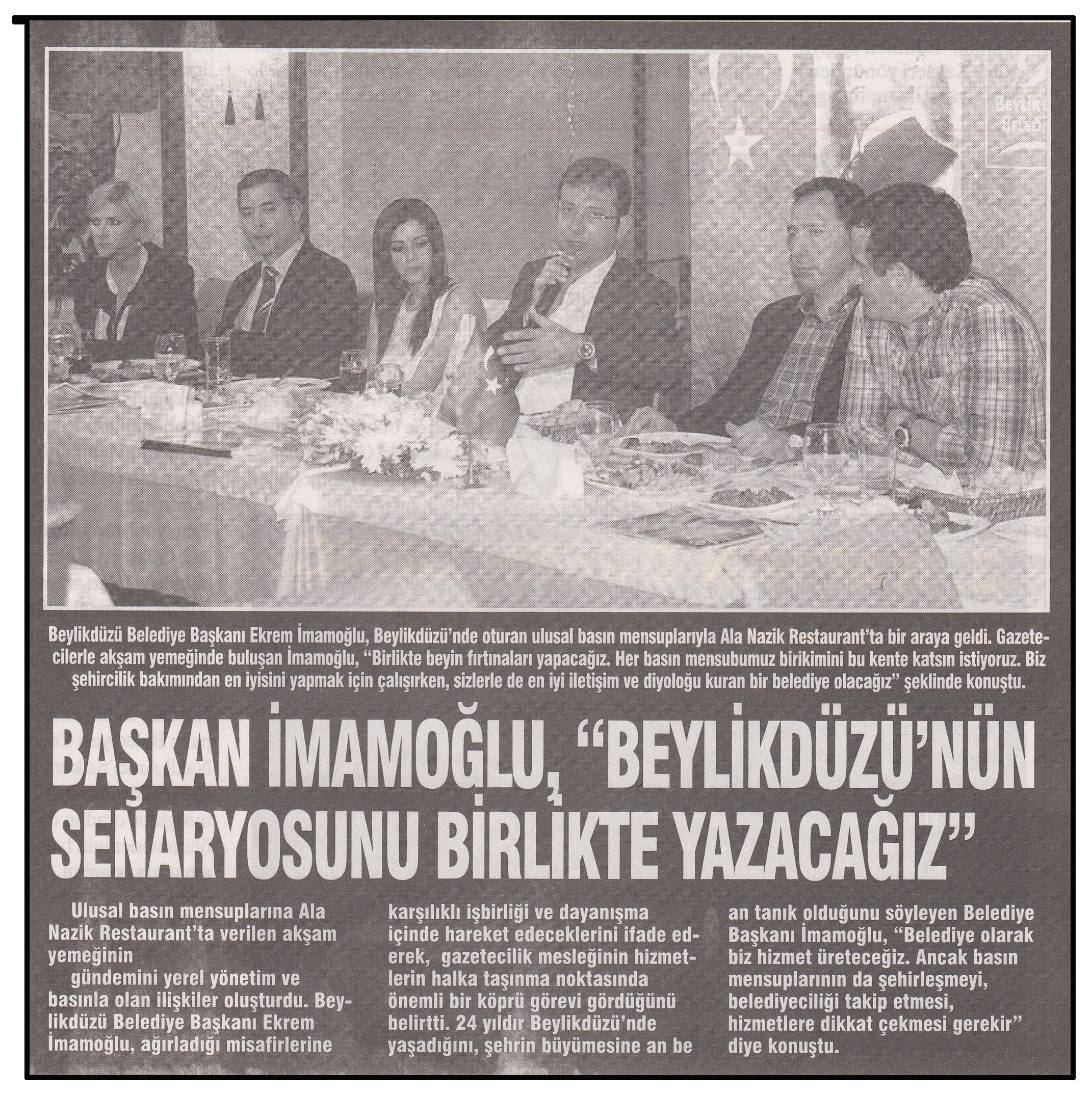 4 Haziran 2014 tarihli "YURT HABER" gazetesi. Beylikdüzü Belediye Başkanı Ekrem İmamoğlu, Beylikdüzü'nde oturan ulusal basın mensuplarıyla Ala Nazik Restaurant'ta bir araya geldi.
