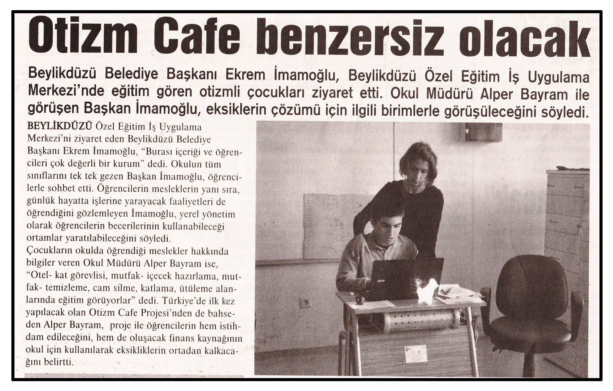 15 Mayıs 2014 tarihli "MARMARA" gazetesi. Beylikdüzü Belediye Başkanı Ekrem İmamoğlu, Beylikdüzü Özel Eğitim İş Uygulama Merkezi'nde eğitim gören otizmli çocukları ziyaret etti. Okul Müdürü Alper Bayram ile görüşen Başkan İmamoğlu, eksiklerin çözümü için ilgili birimlerle görüşüleceğini söyledi.