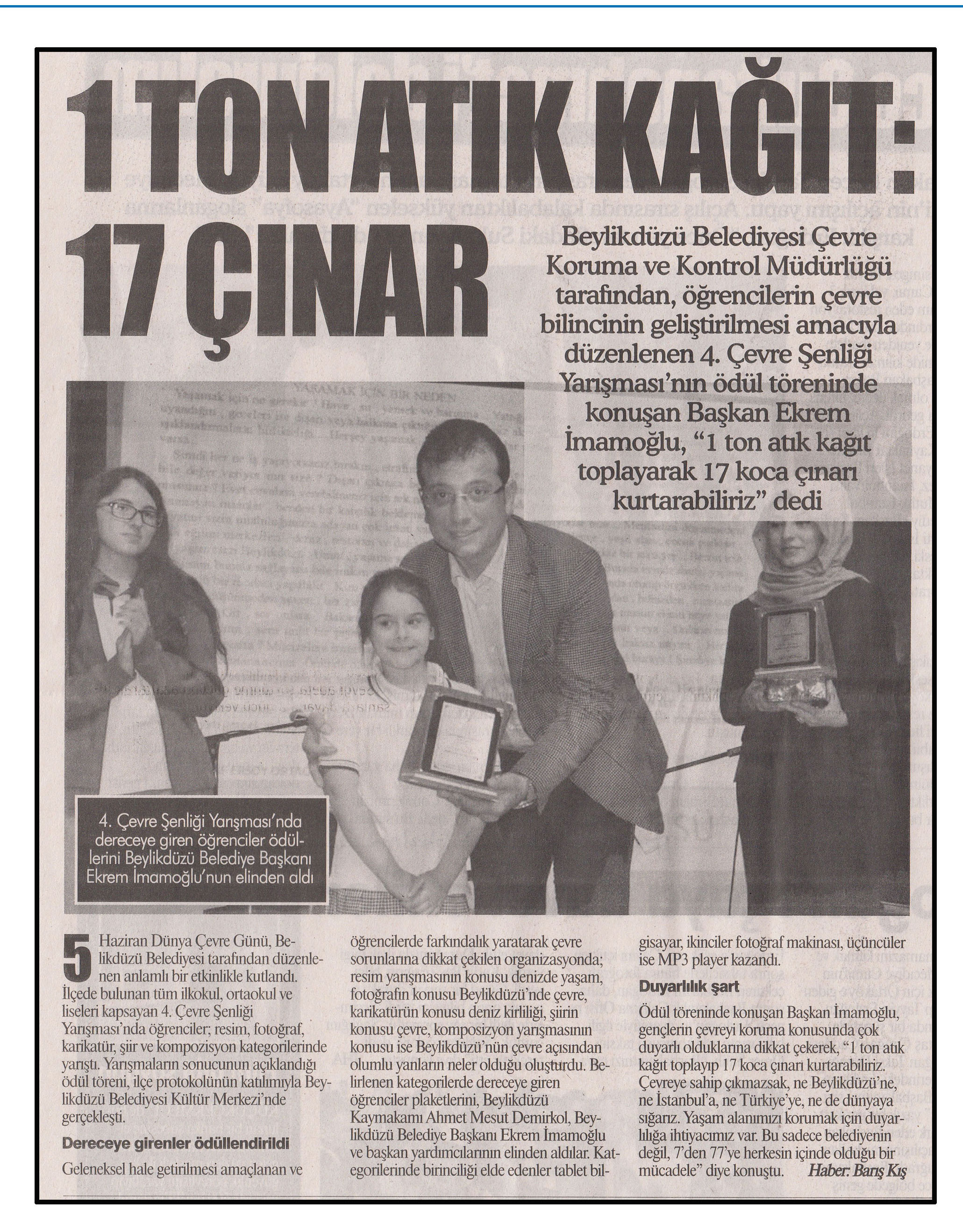 9 Haziran 2014 tarihli "GAZETE İSTANBUL" gazetesi. Beylikdüzü Belediyesi Çevre Koruma ve Kontrol Müdürlüğü tarafından, öğrencilerin çevre bilincinin geliştirilmesi amacıyla düzenlenen 4. Çevre Şenliği Yarışması'nın ödül töreninde konuşan Başkan Ekrem İmamoğlu,"1 ton atık kağıt toplayarak 17 koca çınarı kurtarabiliriz" dedi.