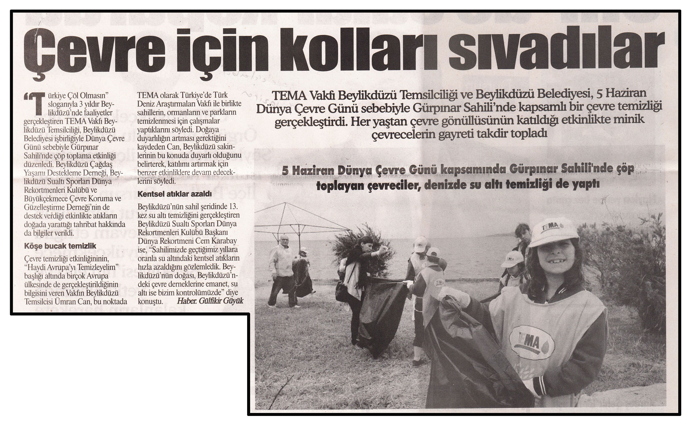 9 Haziran 2014 tarihli "GAZETE İSTANBUL" gazetesi. TEMA Vakfı Beylikdüzü Temsilciliği ve Beylikdüzü Belediyesi, 5 Haziran Dünya Çevre Günü sebebiyle Gürpınar Sahili'nde kapsamlı bir çevre temizliği gerçekleştirdi. Her yaştan çevre gönüllüsünün katıldığı etkinlikte minik çevrecilerin gayreti takdir topladı.
