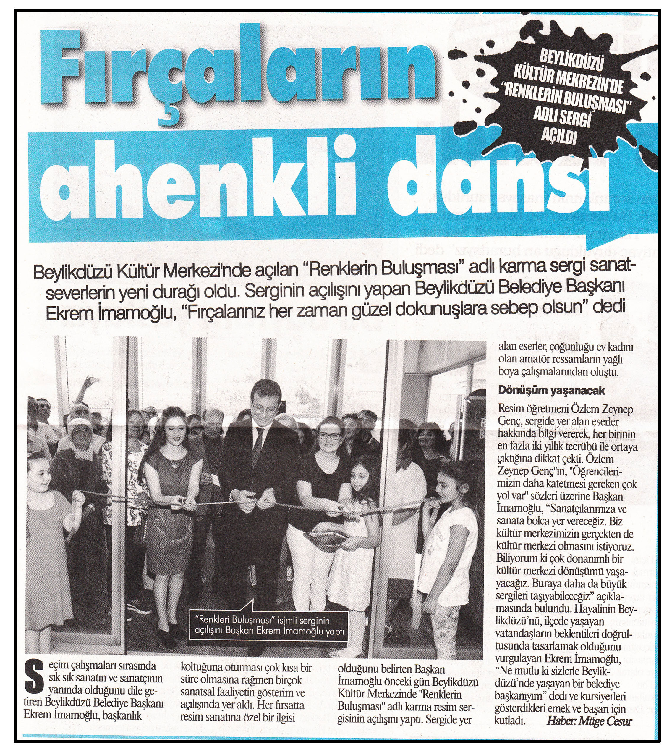 21 Mayıs 2014 tarihli "GAZETE İSTANBUL" gazetesi. Beylikdüzü Kültür Merkezi'nde açılan "Renklerin Buluşması" adlı karma sergi sanatseverlerin yeni durağı oldu. Serginin açılışını yapan Beylikdüzü Belediye Başkanı Ekrem İmamoğlu, "Fırçalarınız her zaman güzel dokunuşlara sebep olsun" dedi.