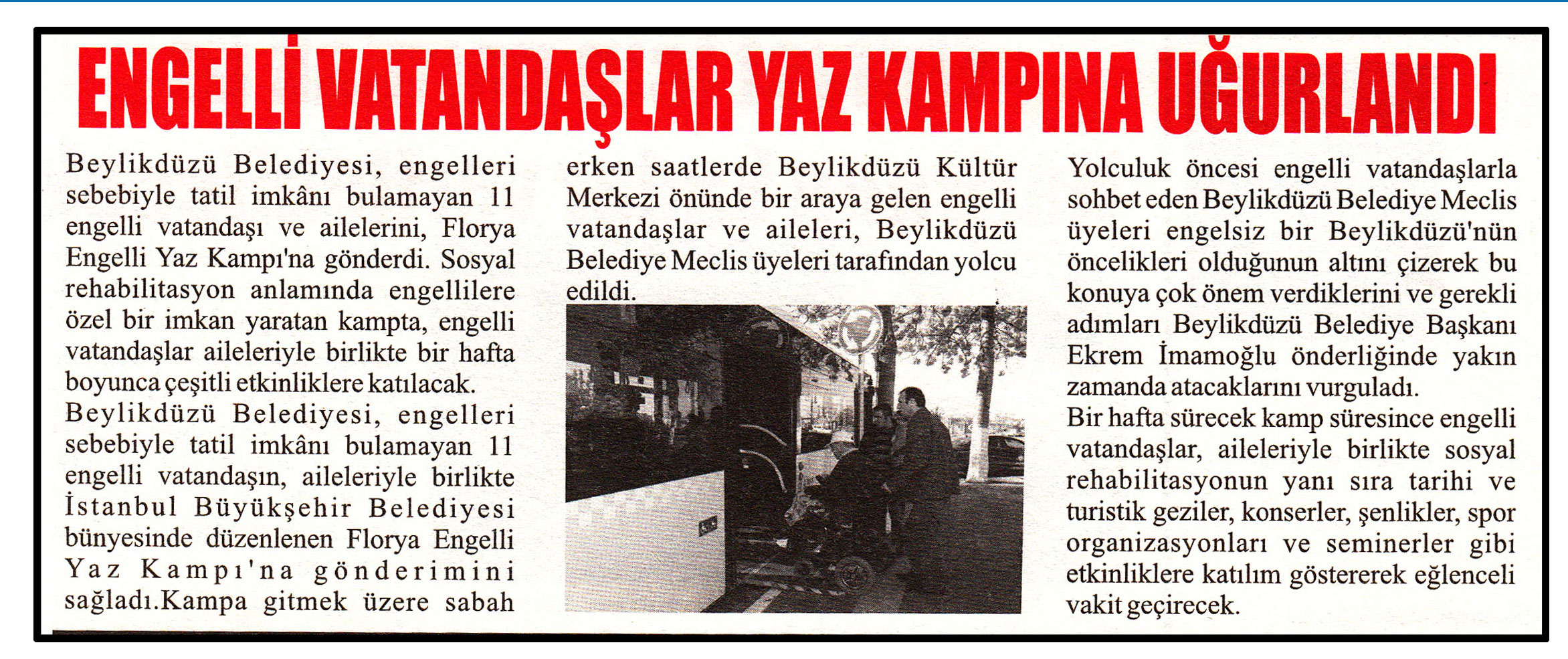 22 Mayıs 2014 tarihli "KIRMIZI BÜLTEN" gazetesi. Beylikdüzü Belediyesi, engelleri sebebiyle tatil imkanı bulamayan 11 engelli vatandaşı ve ailelerini, Florya Engelli Yaz Kampı'na gönderdi. Sosyal rehabilitasyon anlamında engellilere özel bir imkan yaratan kampta, engelli vatandaşlar aileleriyle birlikte bir hafta boyunca çeşitli etkinliklere katılacak.